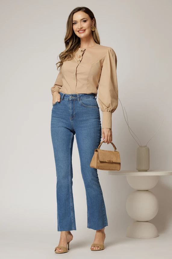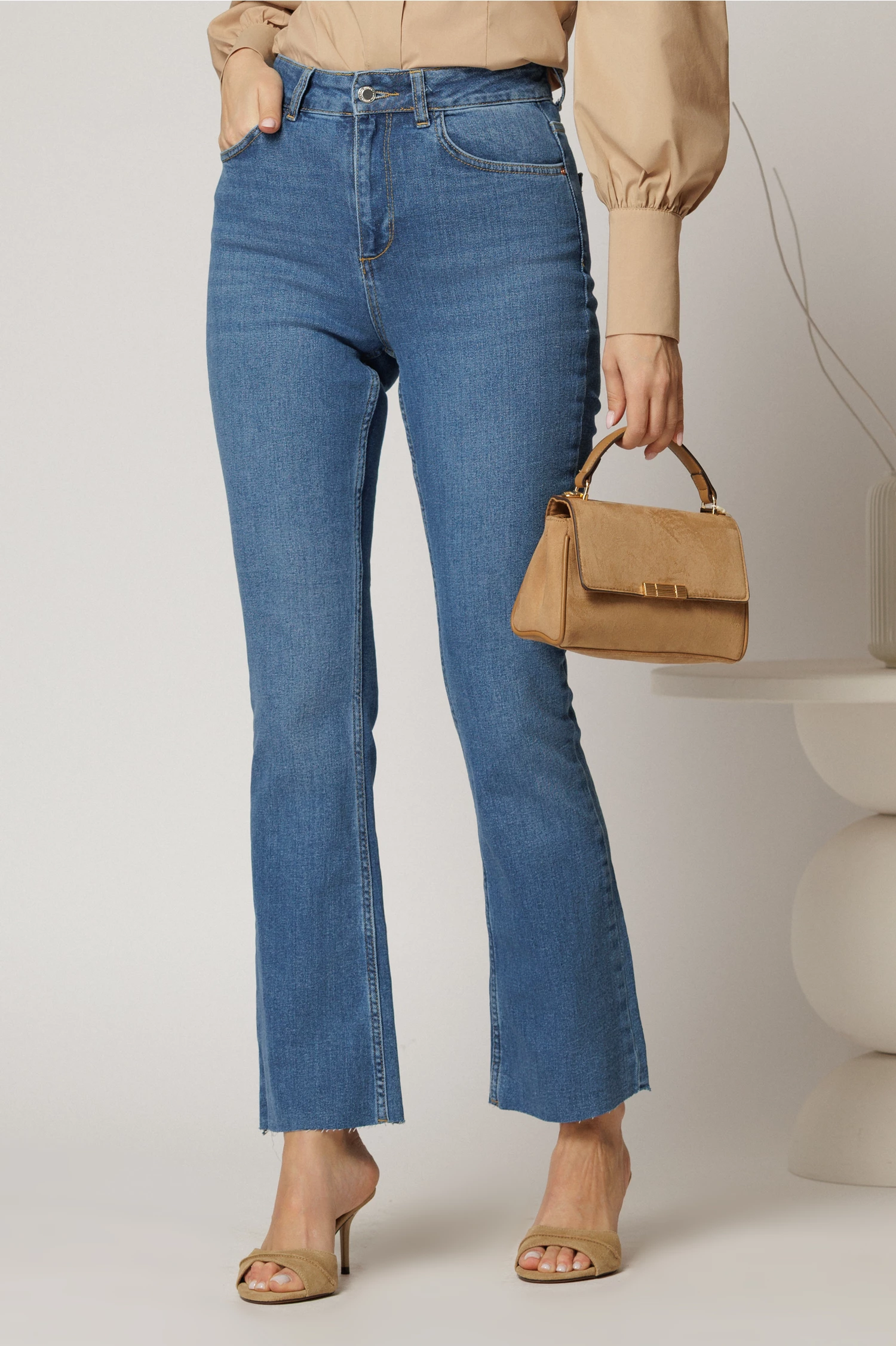 Alege o pereche de blugi albastri care urmaresc linia corpului, cu un croi usor evazat si talia inalta.