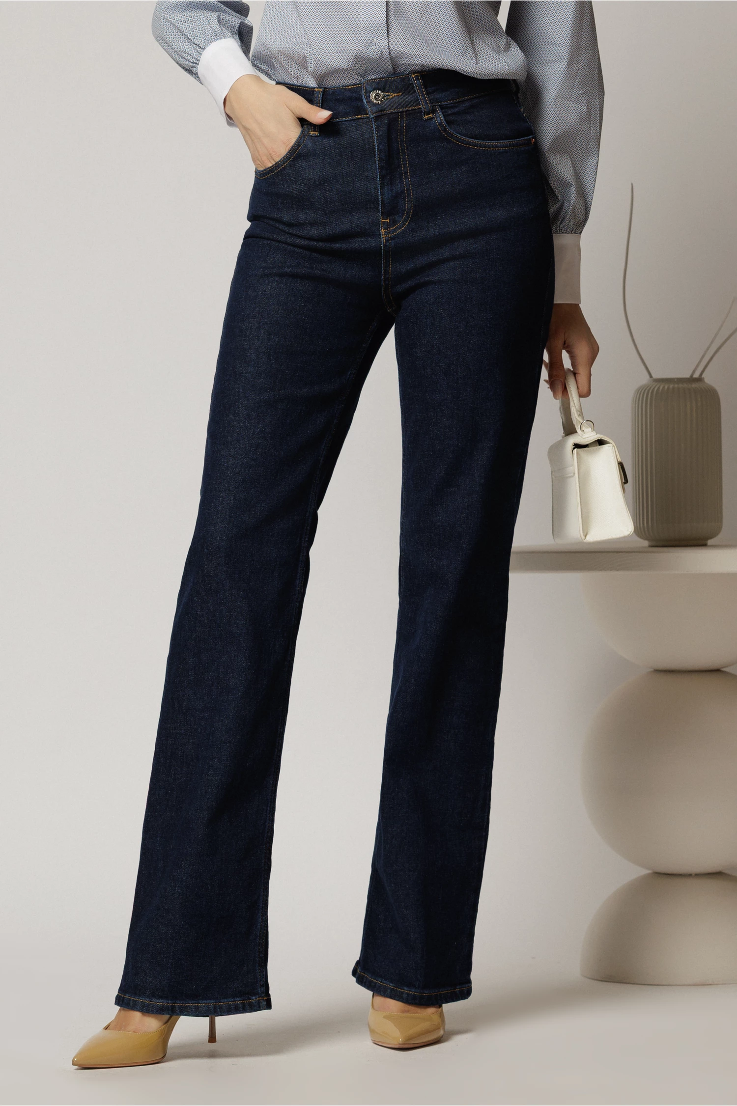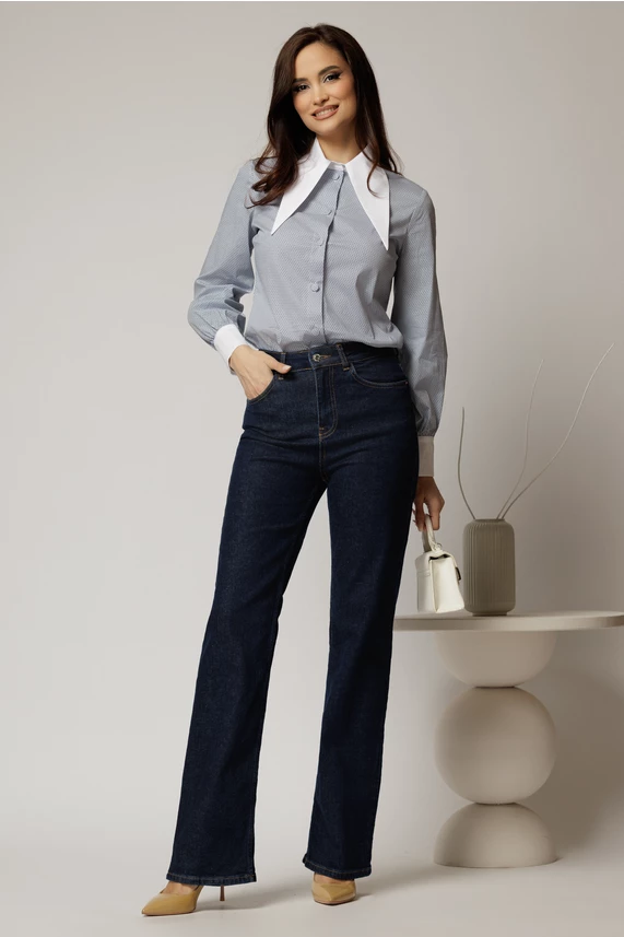 Blugi dama evazati bleumarin inchis cu talie inalta
