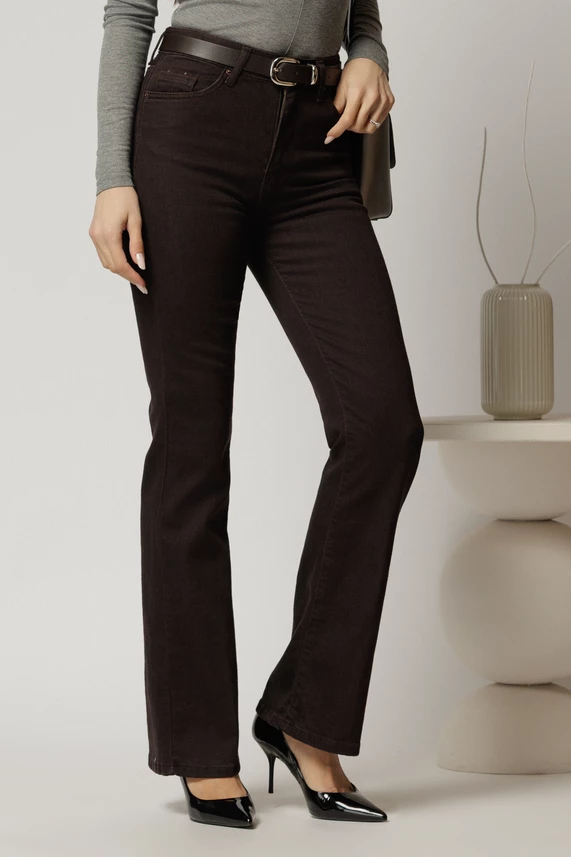 Este o pereche de blugi maro, cu talia inalta si croiul evazat in care te vei simti foarte comod.