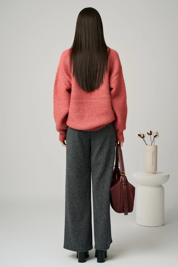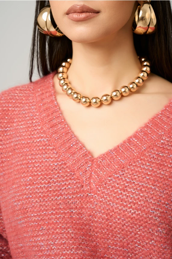 Bluza casual din tricot cu fir lurex. Are decolteu in V, maneci lungi si croi drept.