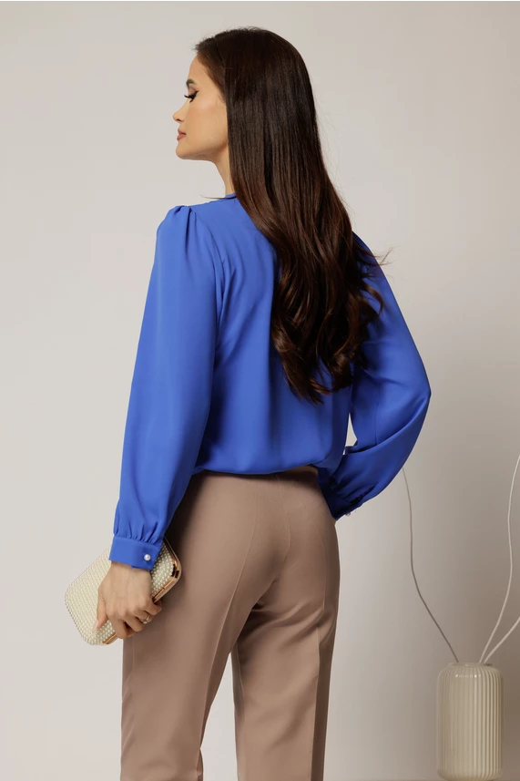 Este o bluza albastra eleganta din voal plin, cu decolteul rotund accesorizat cu perle si pliuri. Bluza asre croiul lejer si manecile lungi.