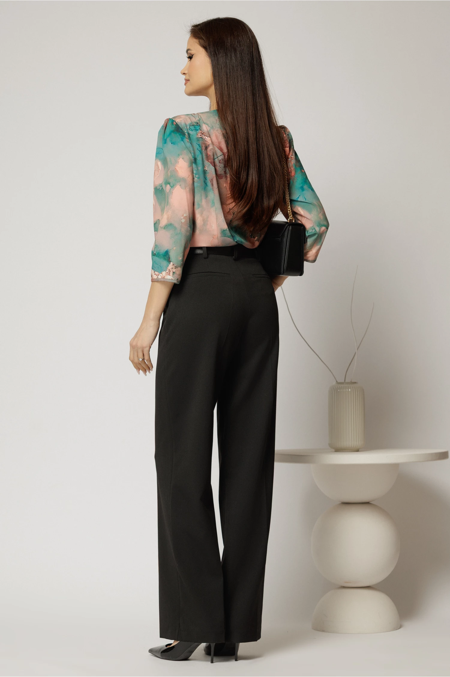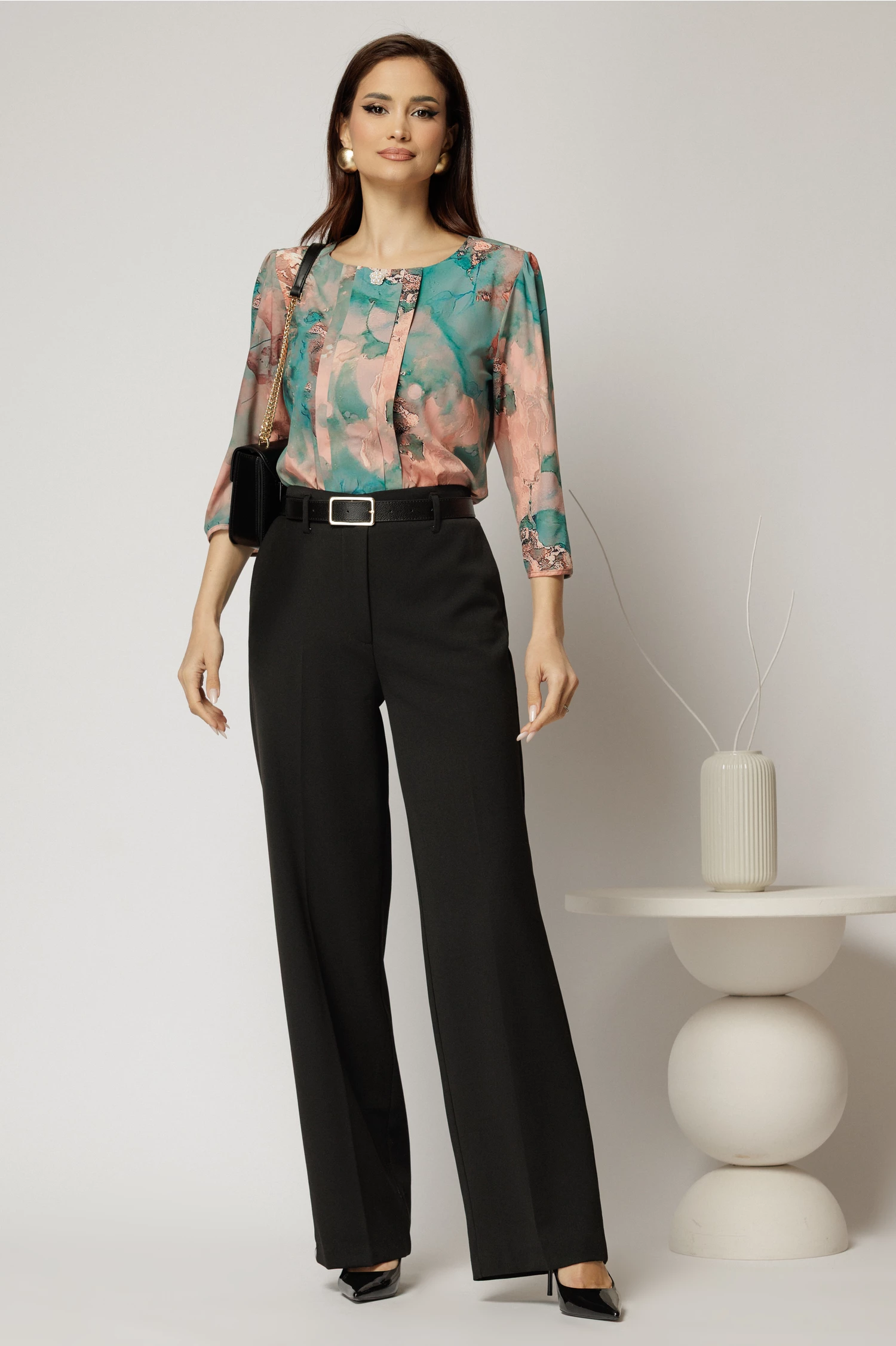 Este o bluza eleganta in nuante de verde si oranj, cu maneci trei sferturi. Bluza are decolteul rotund, pliuri si brosa la bust.