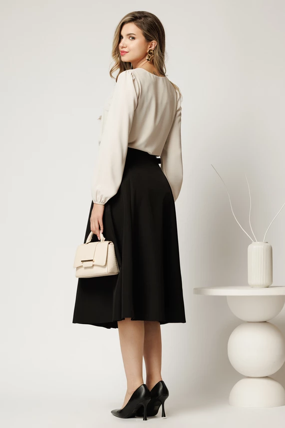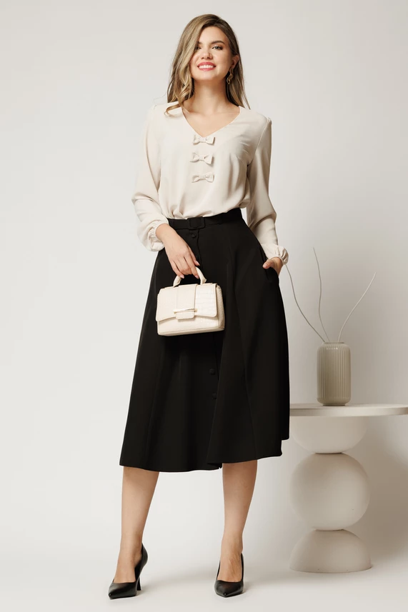 Alege la birou o bluza eleganta de culoare crem, al carei bust este accesorizat cu funde. Decolteul este in V, iar croiul este lejer.