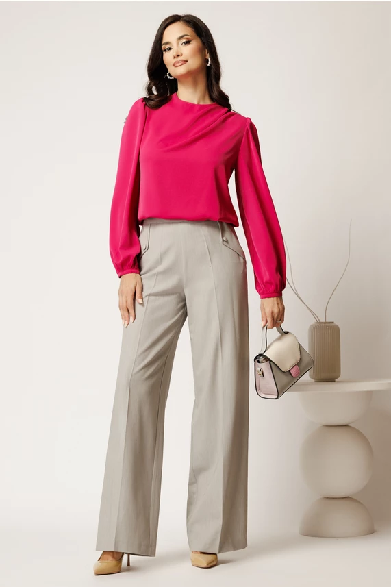 Bluza eleganta din triplu voal cu pliuri pe un umar. Are decolteu rotund, maneci lungi si croi drept.