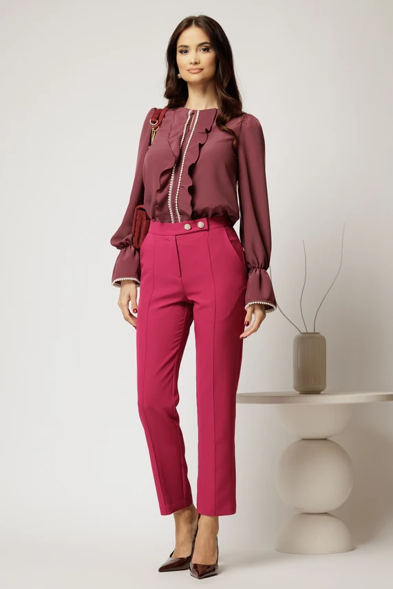 Este o bluza eleganta din voal plin, de culoare mov pruna, accesorizata cu perle si volanase. Bluza are decolteul rotund, decupaj la bust si manecile cu volanas accesorizat cu perle.