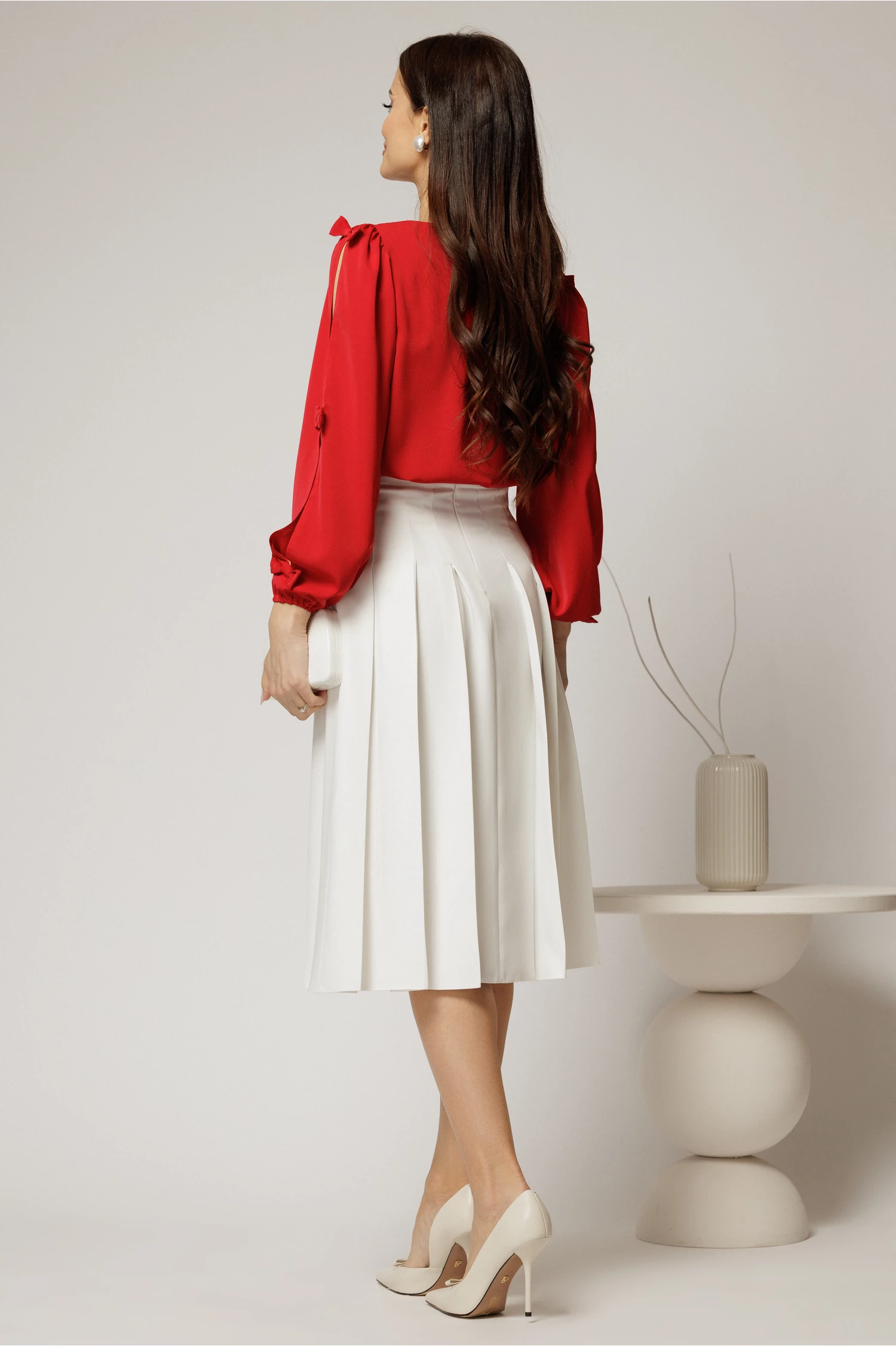 Este o bluza eleganta intr-o superba nuanta de rosu, dintr-un material vaporos potrivit pentru zilele calduroase. Manecile lungi sunt crapate si decorate cu fundite elegante.