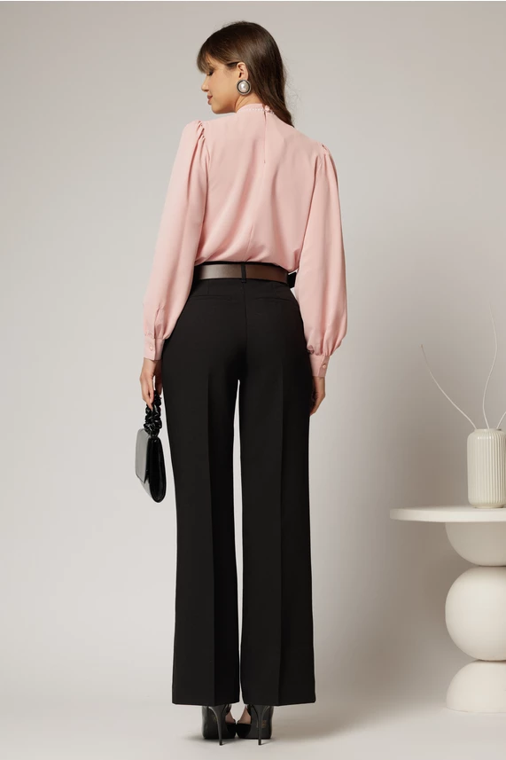 Este o bluza eleganta roz din voal plin, cu decolteul accesorizat cu perle si decupaj.