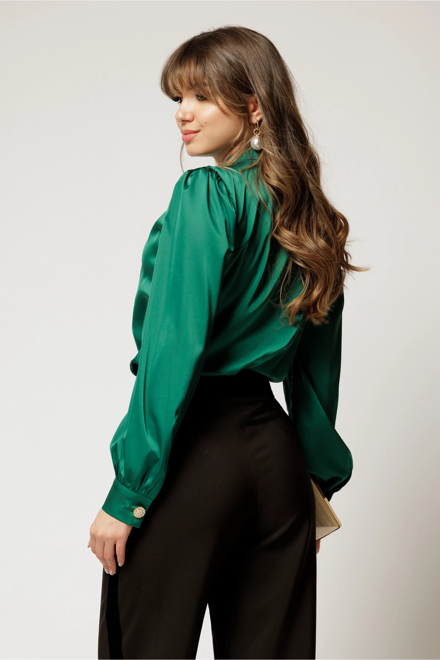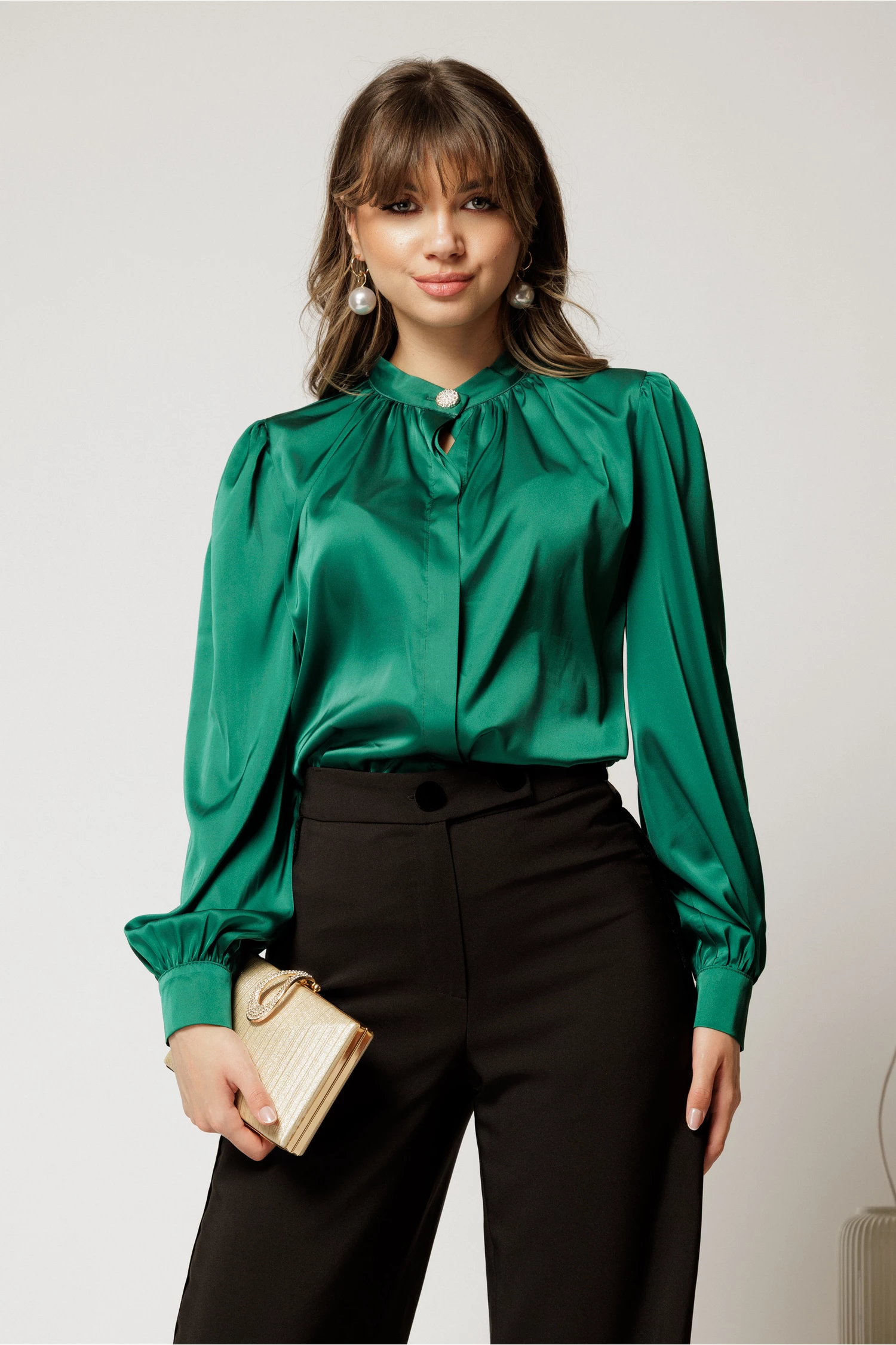 Este o bluza eleganta verde din satin, pe care o poti purta la un eveniment sau la birou. Bluza are gulerul tunica si un nasture elegant.