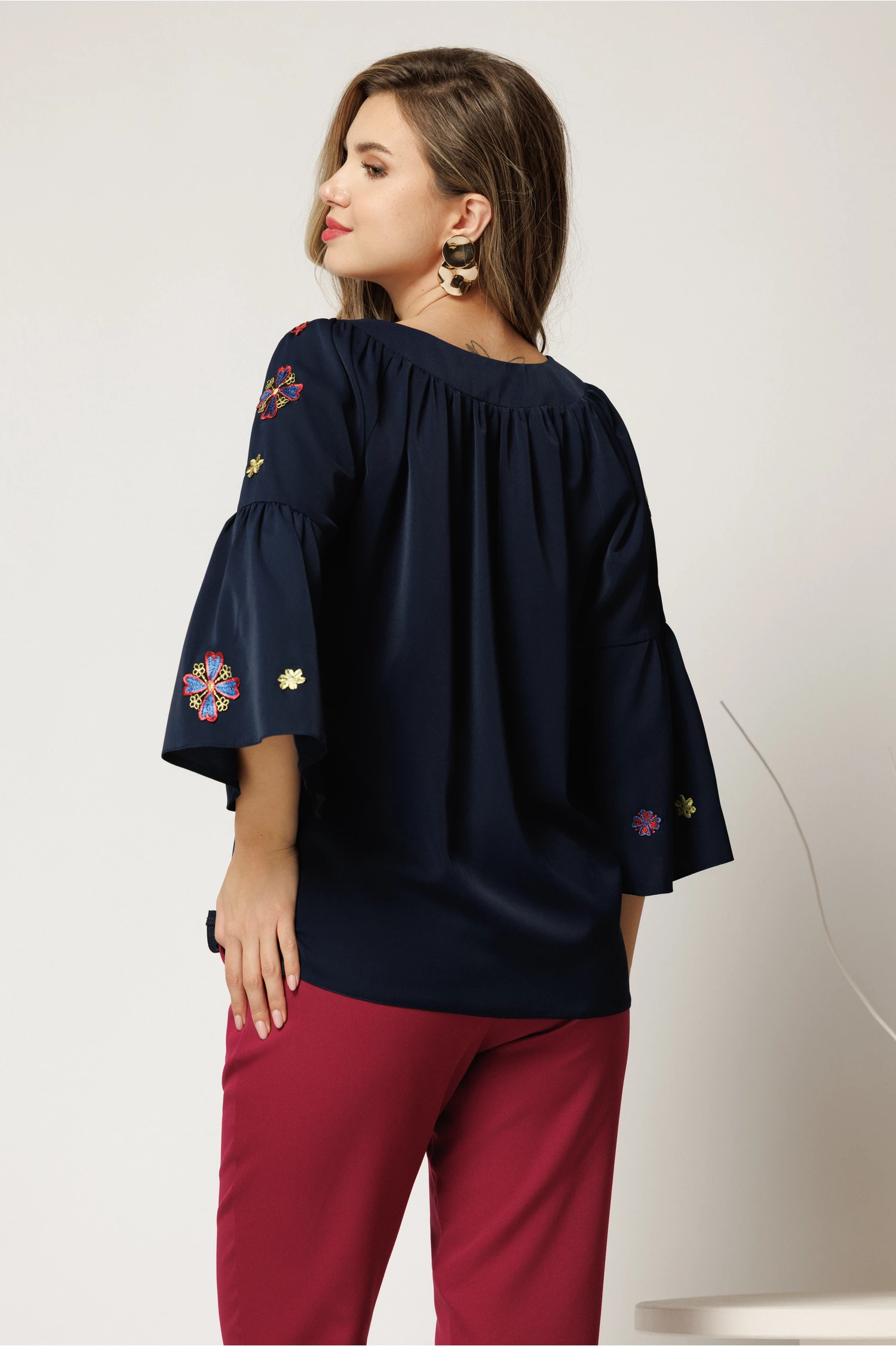 Bluza eleganta bleumarin din viscoza cu broderie. Are decolteu rotund, maneci trei sferturi cu baza clopot si croi drept.