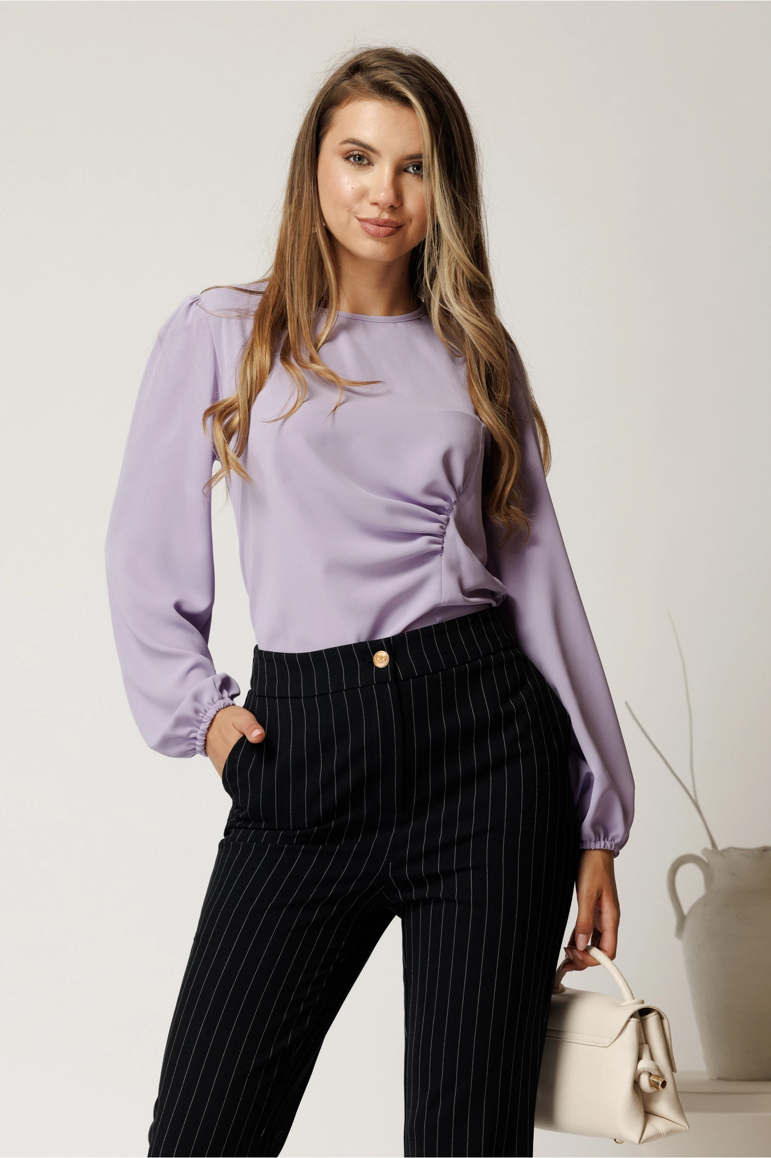 Bluza eleganta vaporoasa din voal cu fronseu pe talie. Are decolteu rotund, maneci lungi si croi cambrat.