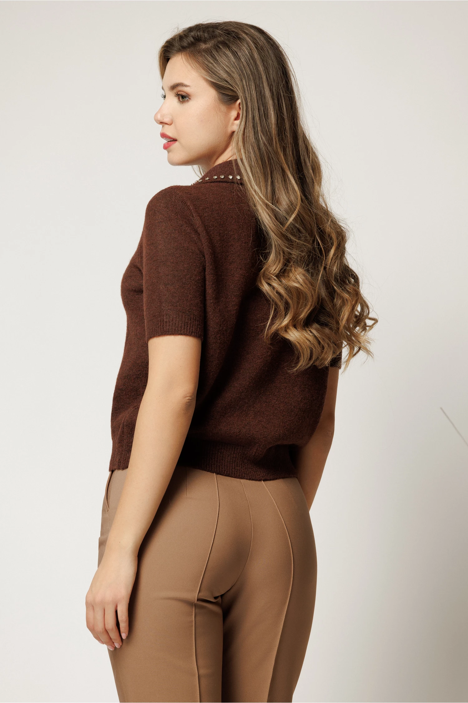 Bluza maro din tricot cu maneci scurte si strasuri pe guler