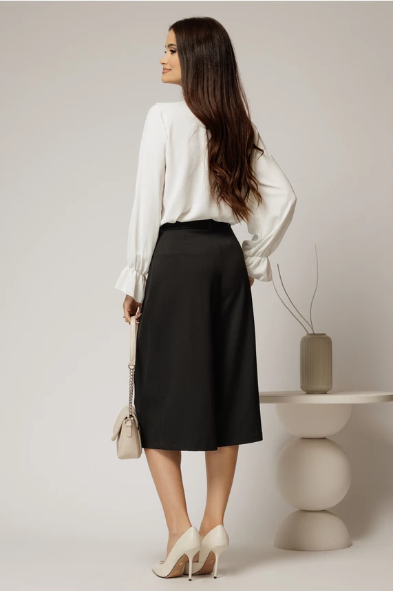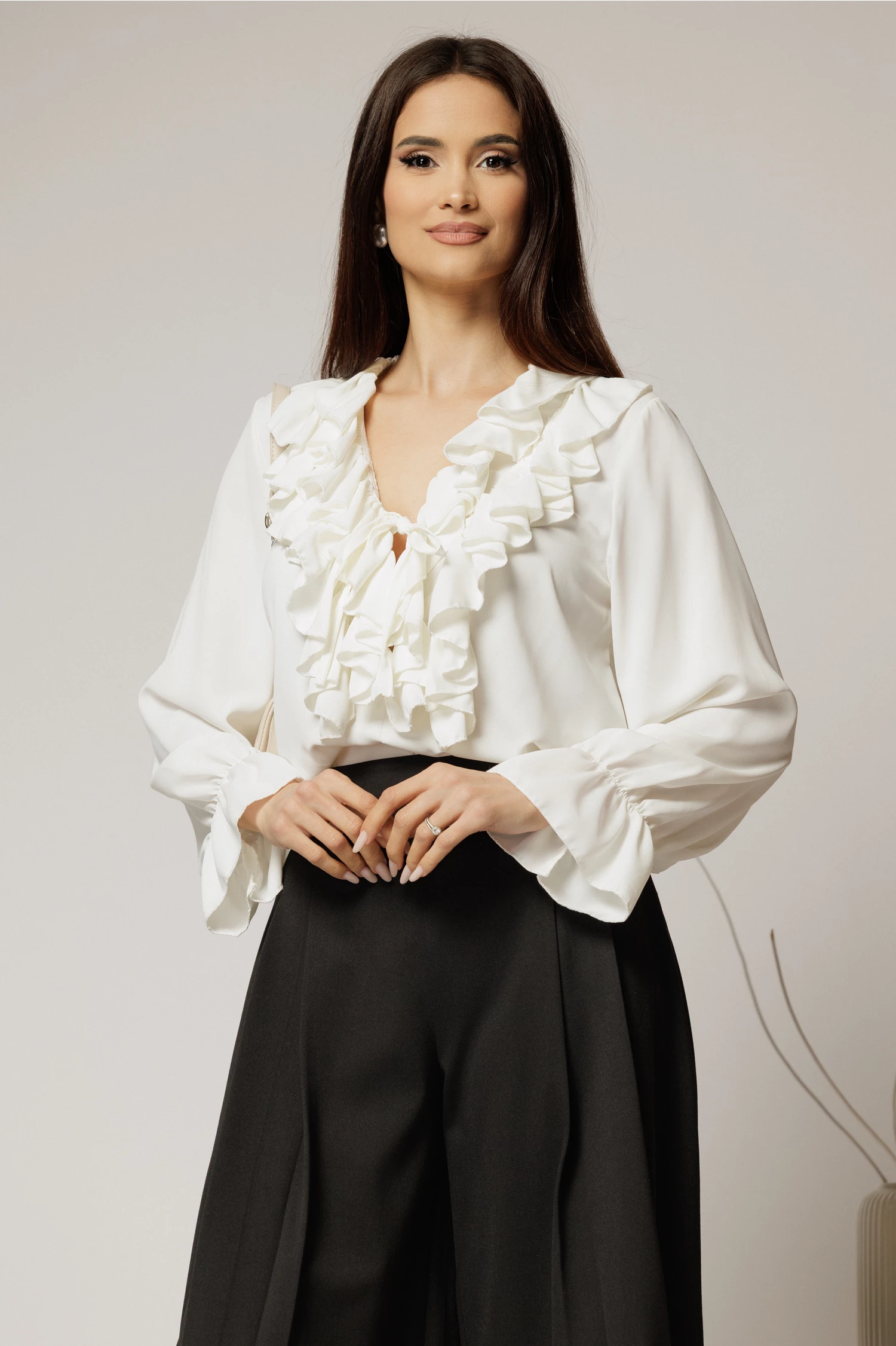 Este o camasa alba din voal plin, cu maneci lungi elegante si volanase la bust. Bluza are croiul lejer si decolteul adanc in V.