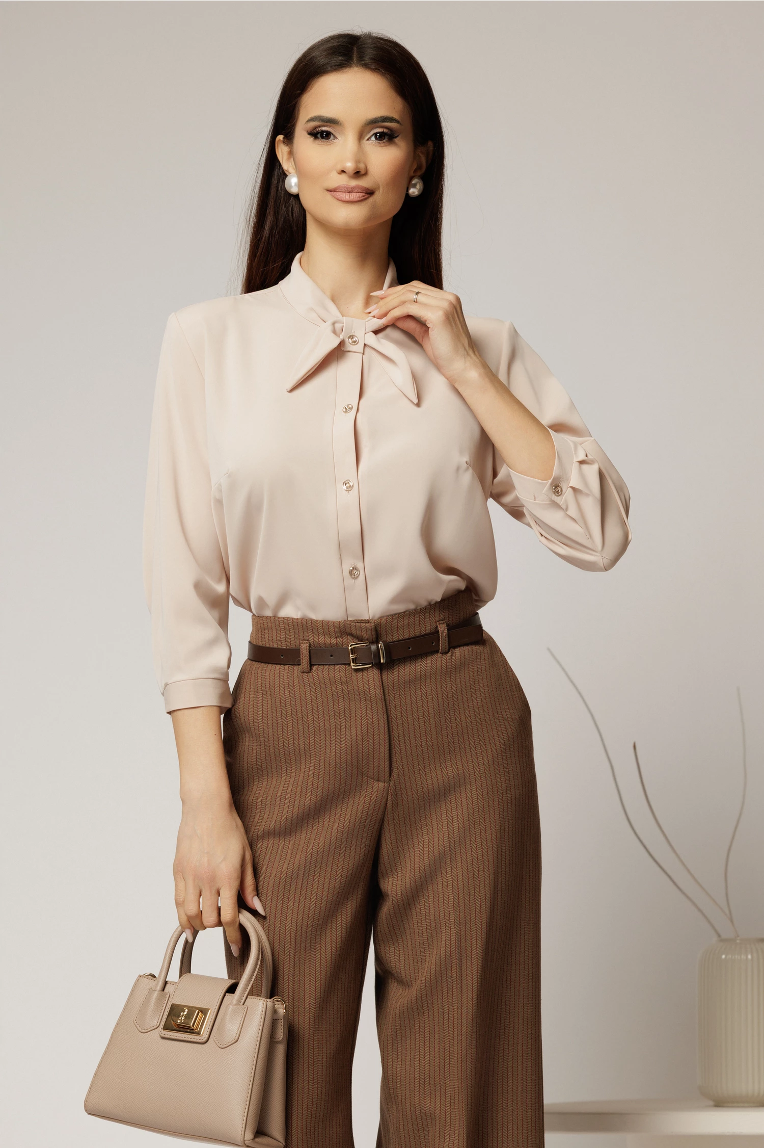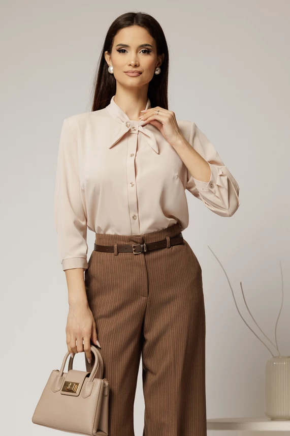 Este o camasa eleganta bej din triplu voal, cu funda eleganta la guler.Camasa are maneci trei sferturi si inchidere cu nasturi eleganti.