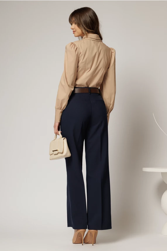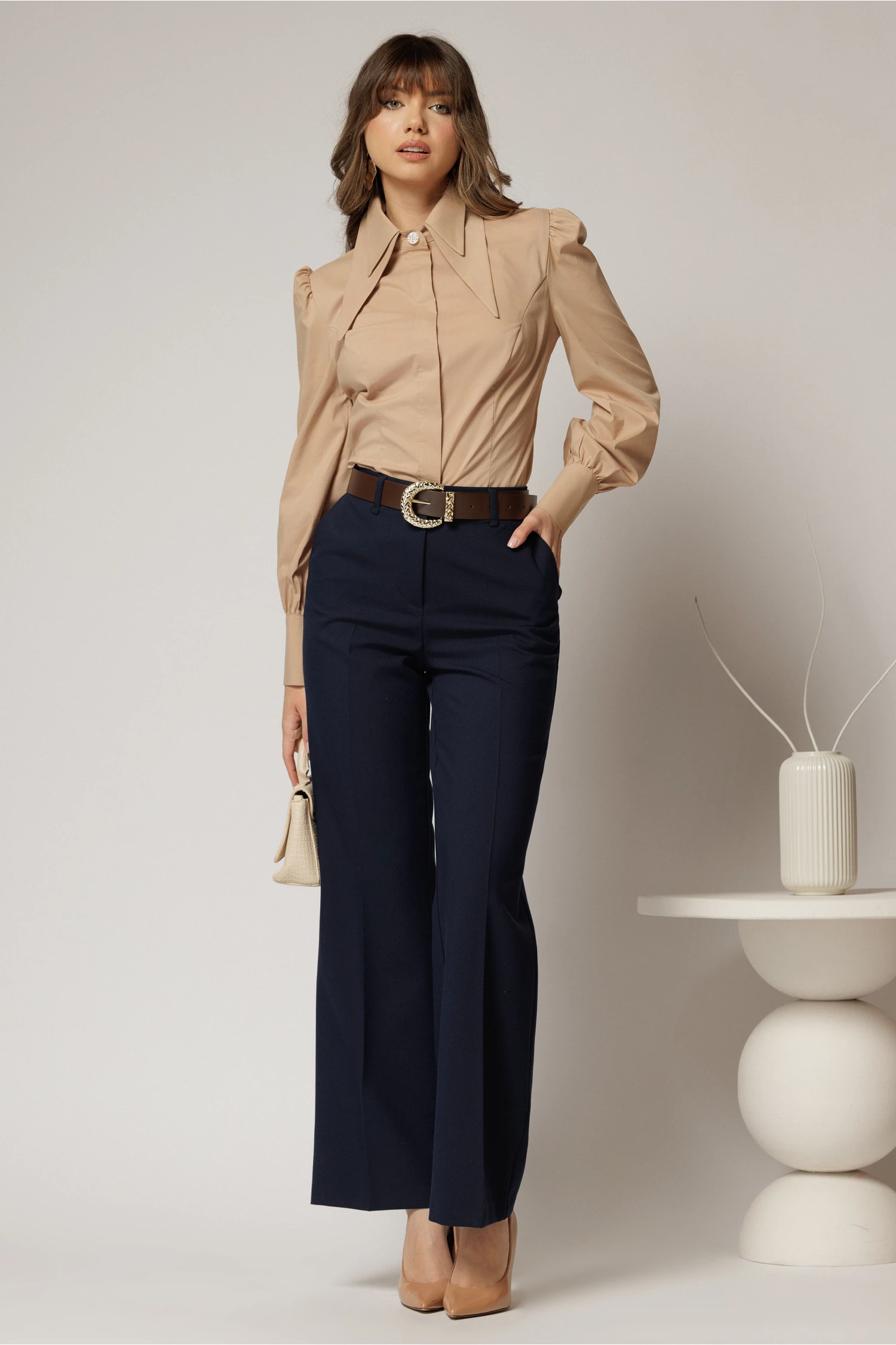 Este o camasa office din poplin de culoare bej cu guler dublu. Camasa are maneci lungi, croi cambrat si nasture pretios la guler.