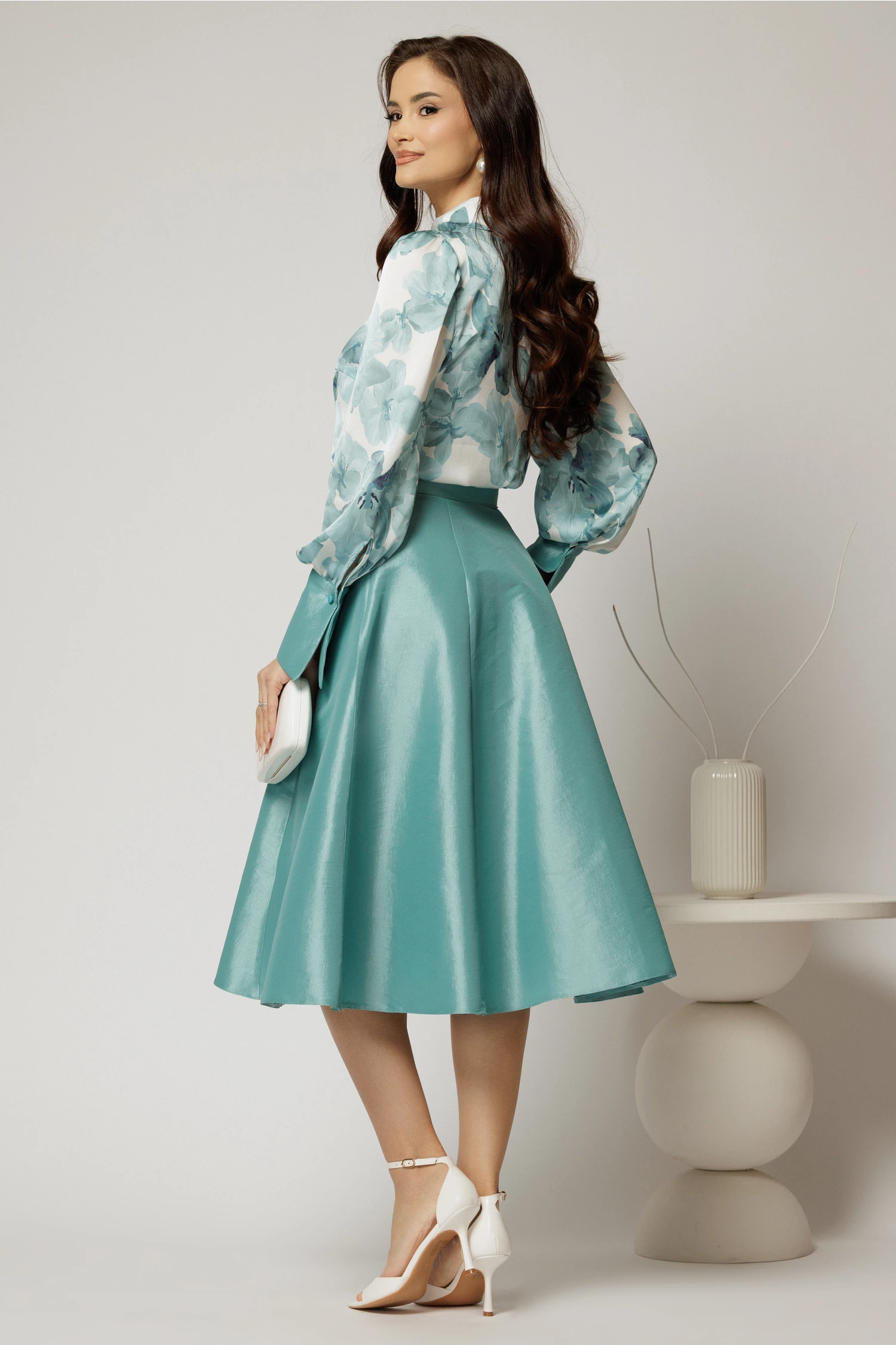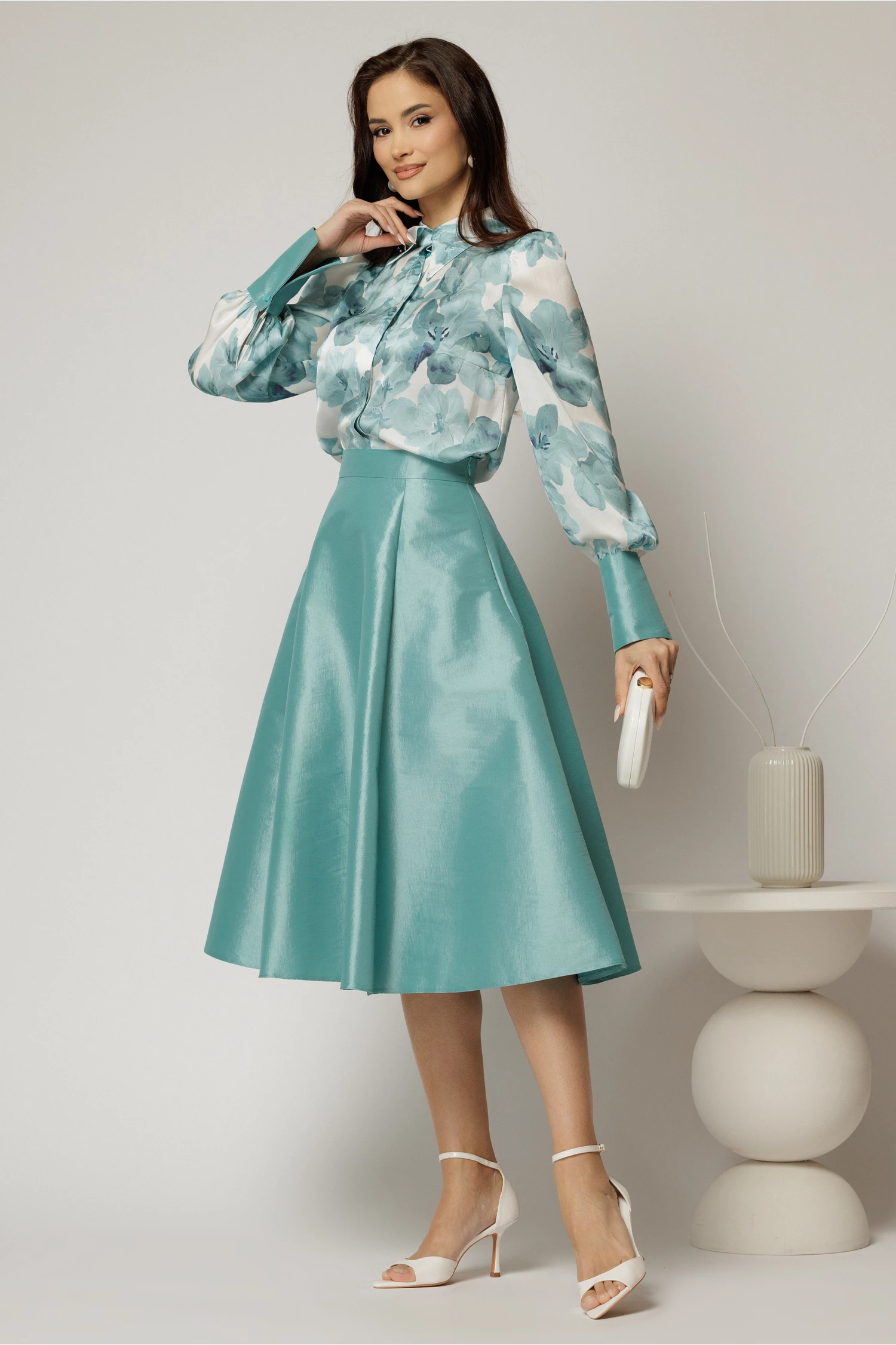 Este o camasa eleganta din voal, cu imprimeuri turcoaz si mansete in contrast din tafta. Camasa are gulerul ascutit si croiul lejer.