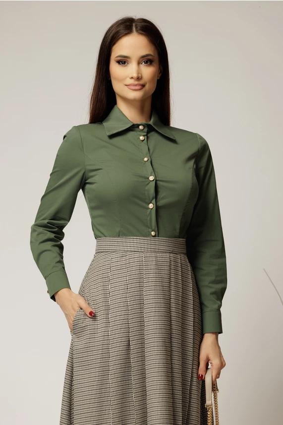 Este o camasa kaki office, din poplin cu croi cambrat si elegant. Camasa are guler elegant si inchidere cu nasturi cu perla.