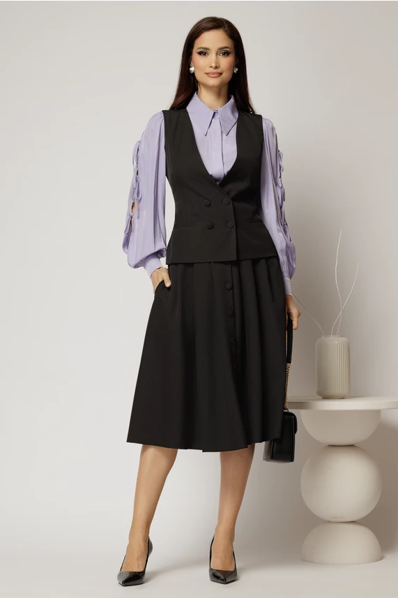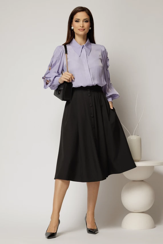 Este o superba camasa lila cu un croi lejer, in care te vei simti confortabil, datorita materialului. Camasa are decupaje si funde pe maneci.