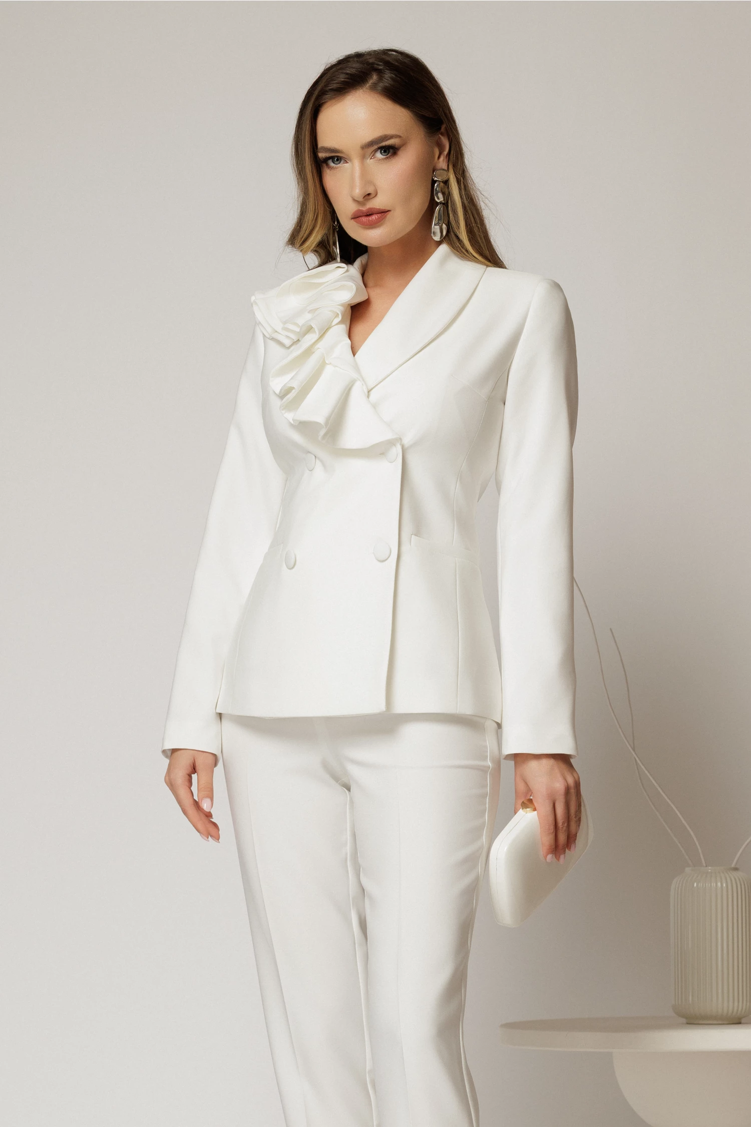 Compleu alb cu pantalon si sacou cu volanase la rever