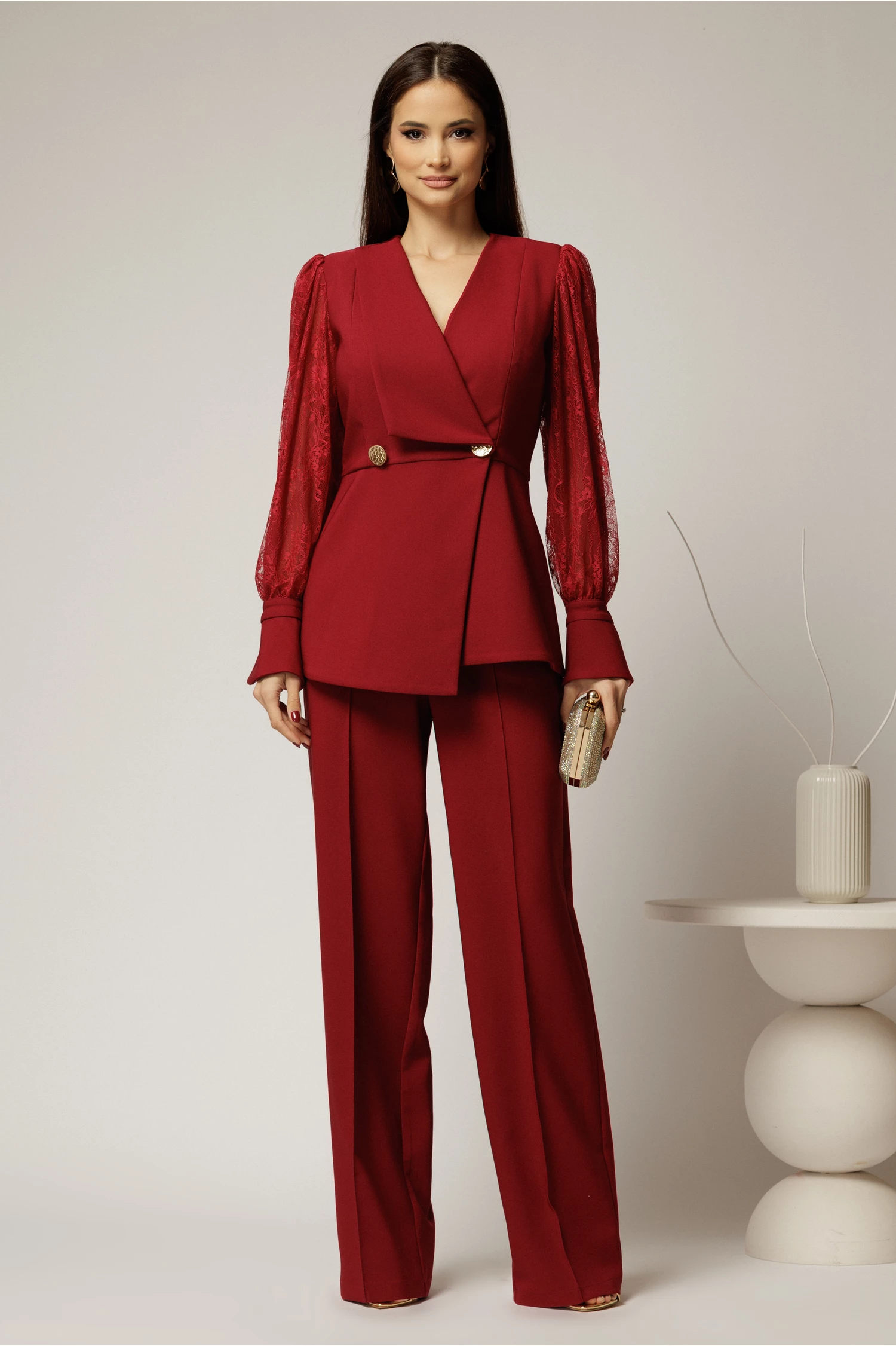 Alege sa porti la evenimentele importante un compleu bordo, format din sacou cu maneci din dantela si pantalon lung evazat. Sacoul compleului se inchide cu nasturi eleganti.
