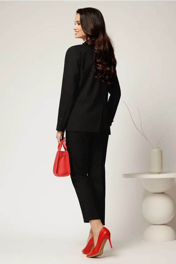 Compleu elegant alcatuit din doua piese. Sacoul este cambrat, are decolteu in V cu rever clasic, maneci lungi si se inchide cu un nasture, iar pantalonii au croi drept, buzunare functionale si se inchid cu sistem mos-baba si fermoar.