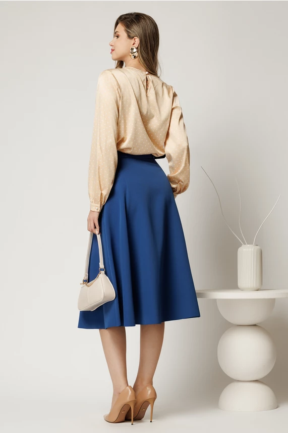 Este o fusta midi din stofa, de culoare albastra, al carei croi clos avantajeaza orice silueta. Inchiderea este cu nasturi frontali, iar talia este accesorizata cu o curea in aceeasi nuanta.