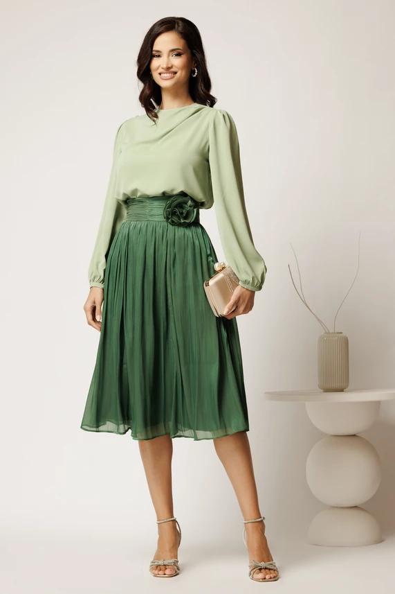 Fusta DY Fashion midi verde in clos din voal cu insertii din fir lurex si floare in talie