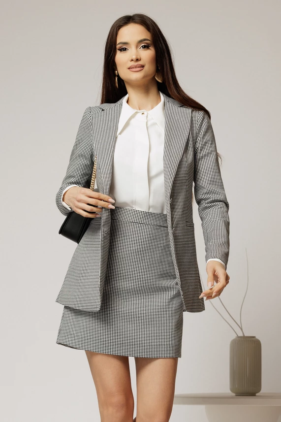 Este o fusta scurta din carou pepit alb negru, cu croi tip A.
