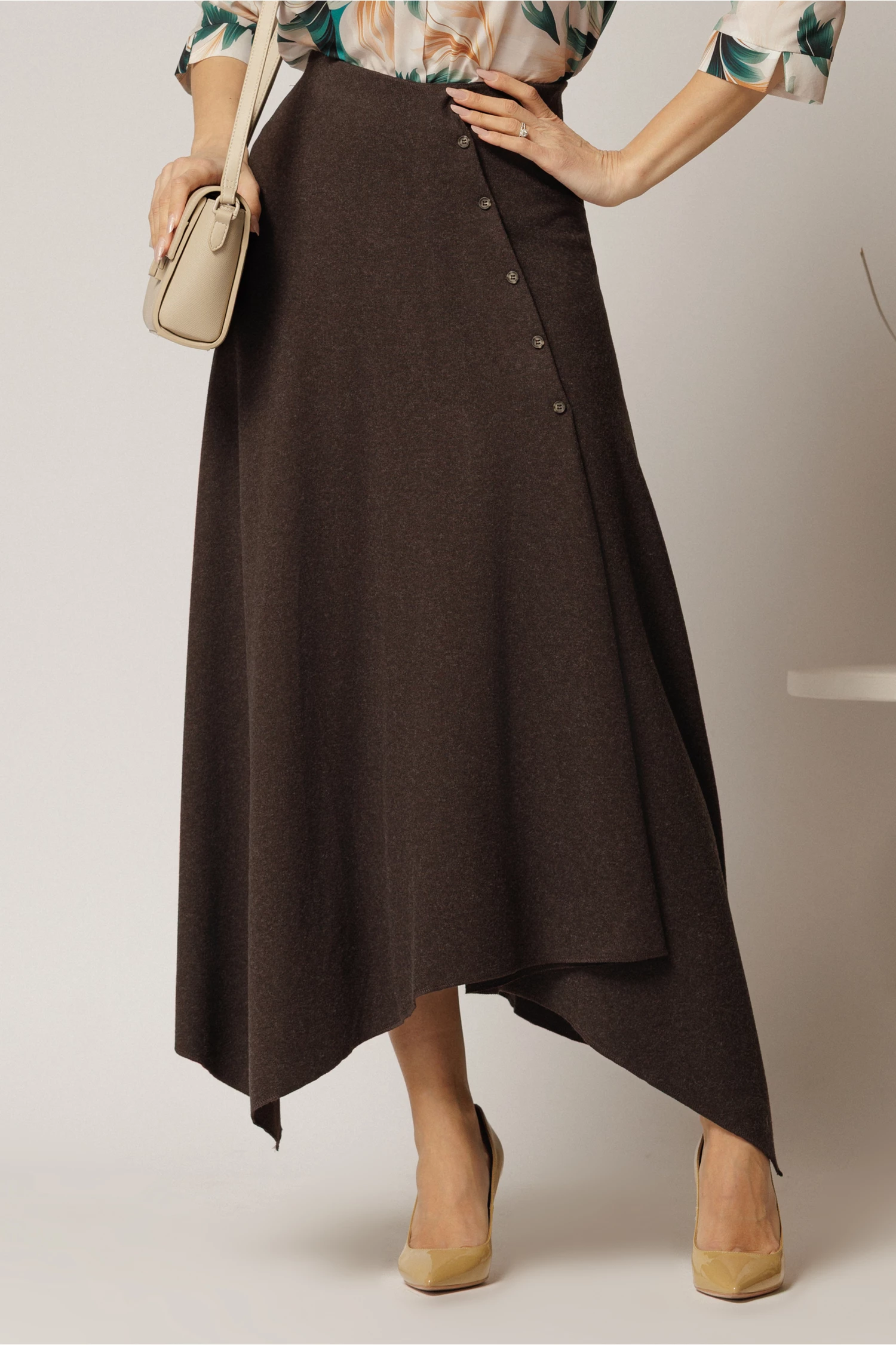 Este o eleganta fusta midi din tricot fin maro, cu design in colturi. Fusta este pe elastic in talie si are nasturi decorativi.