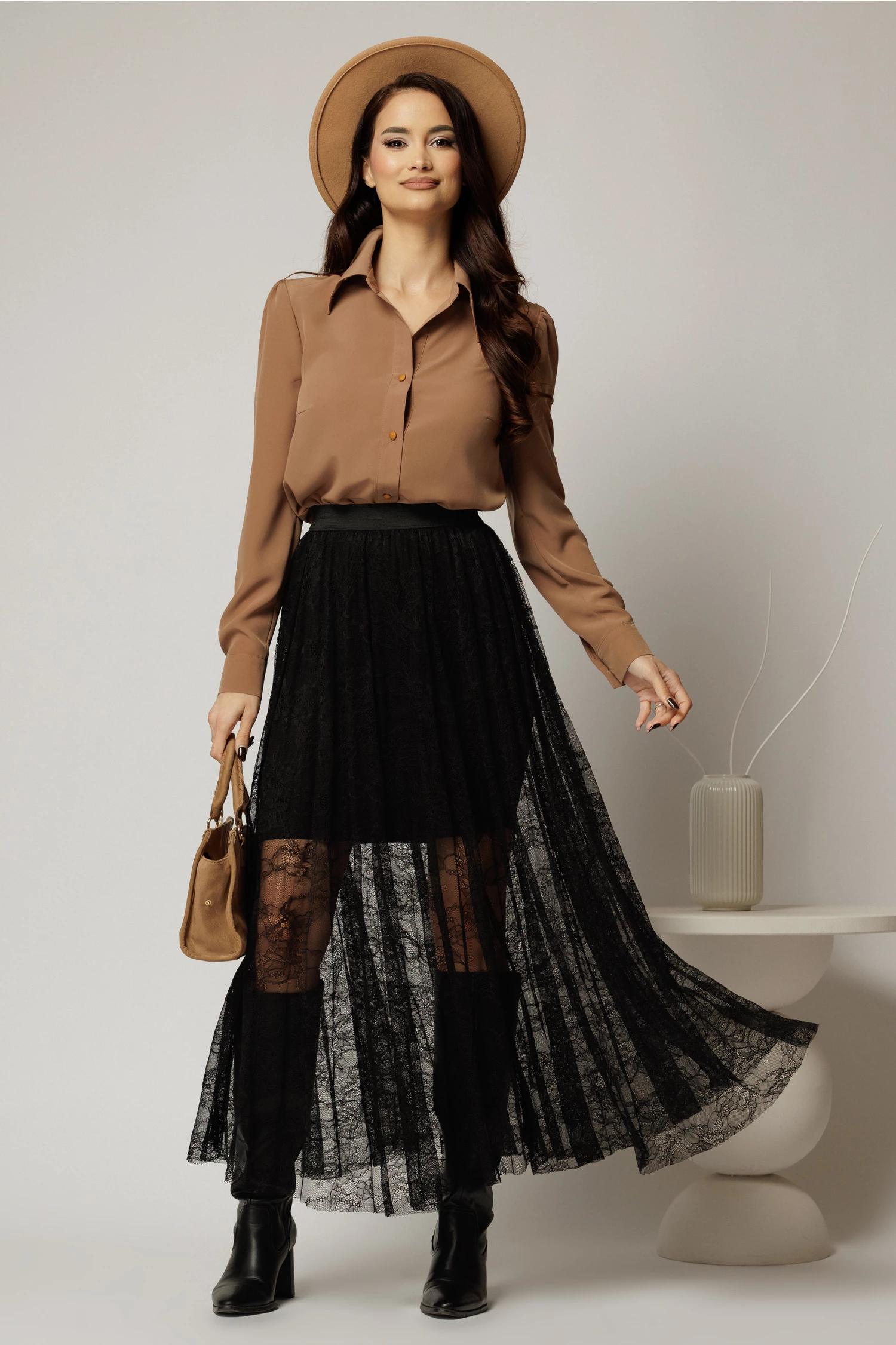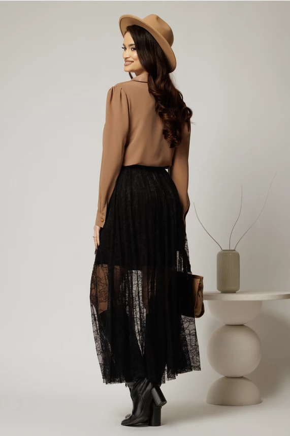 Fusta midi neagra in clos din dantela cu elastic in talie