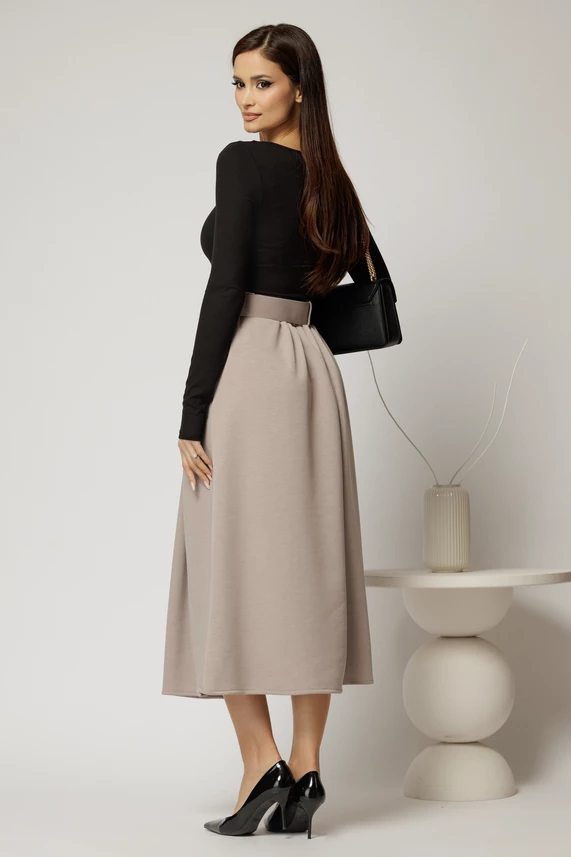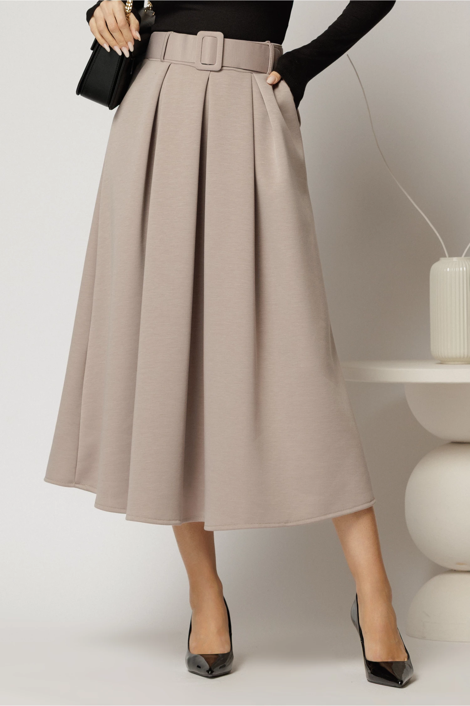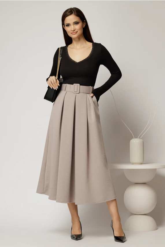 Fusta midi office din jerse bej cu pliuri si curea in talie