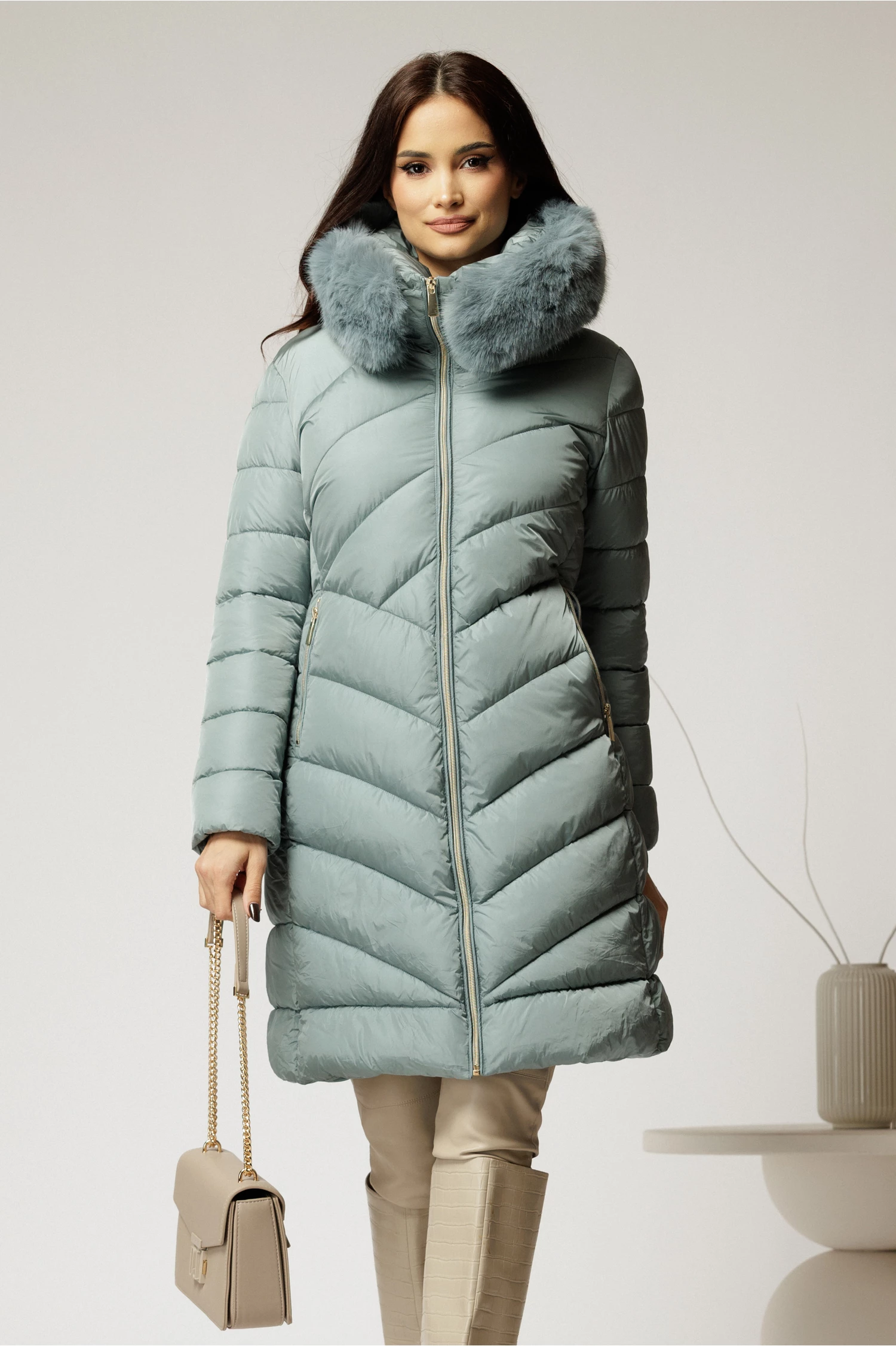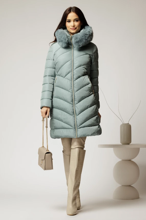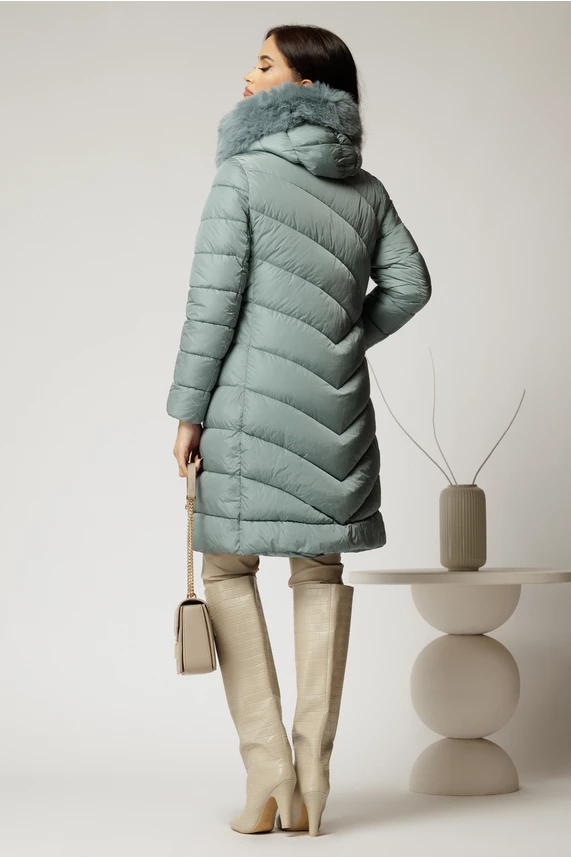 Zilele friguroase de iarna sunt mai usoare si mai elegante cu o geaca albastru bleu midi, cu gluga si blanita detasabila.