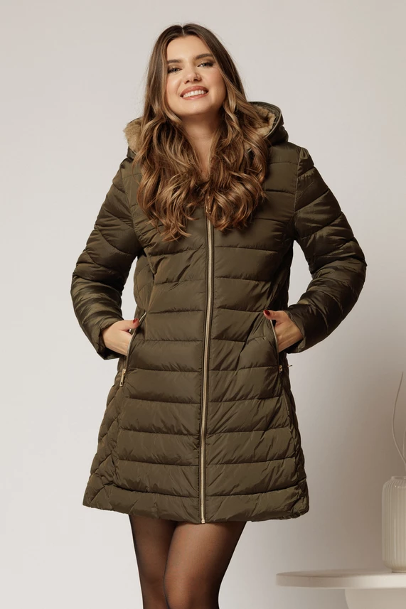 Chic si eleganta in sezonul rece cu o geaca cu croi drept si gluga, al carei interior este partial captusit cu blanita.
