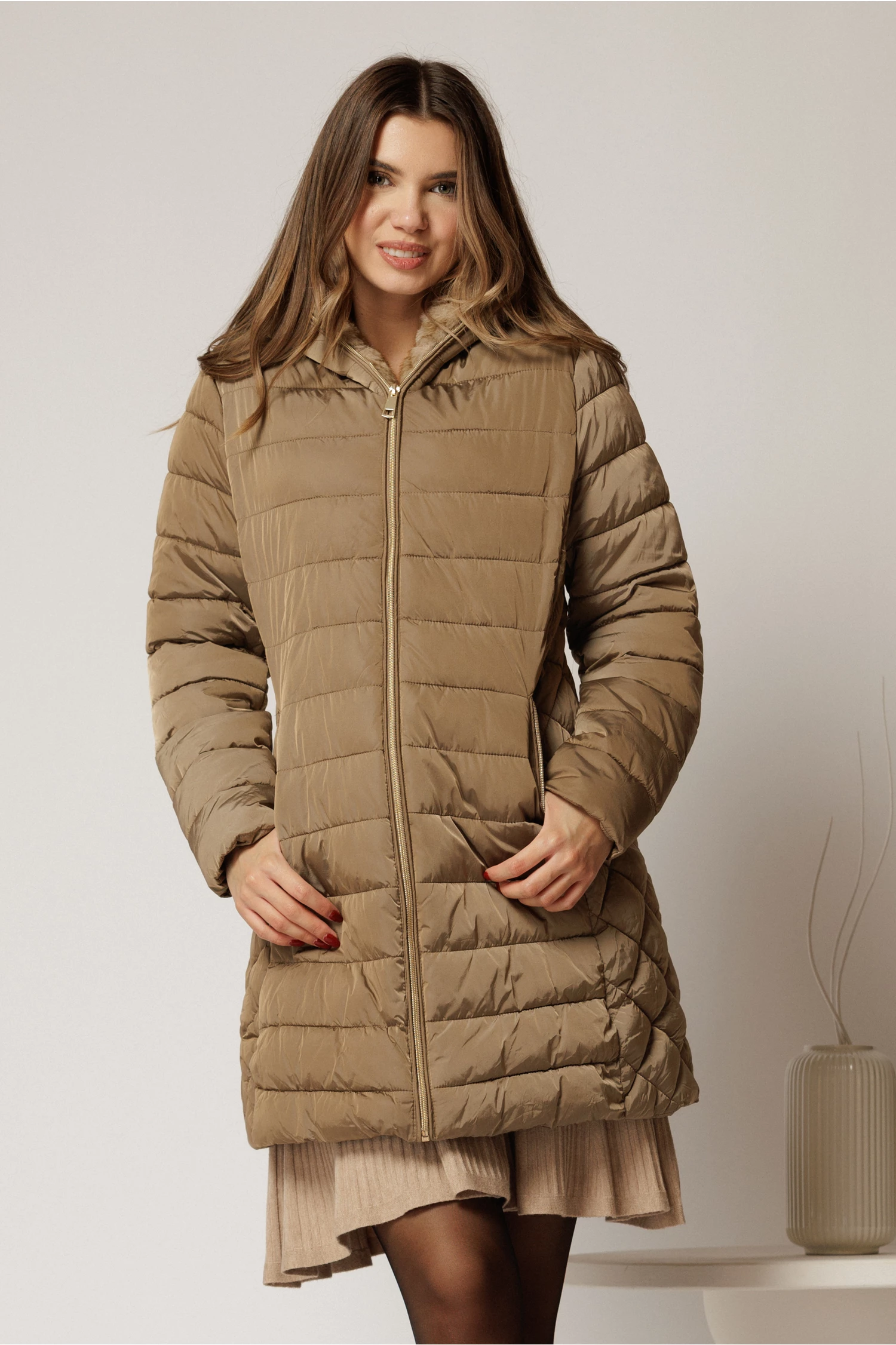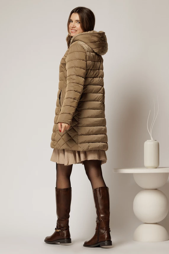 Chic si eleganta in sezonul rece cu o geaca cu croi drept si gluga, al carei interior este partial captusit cu blanita.