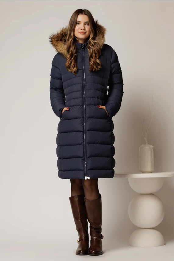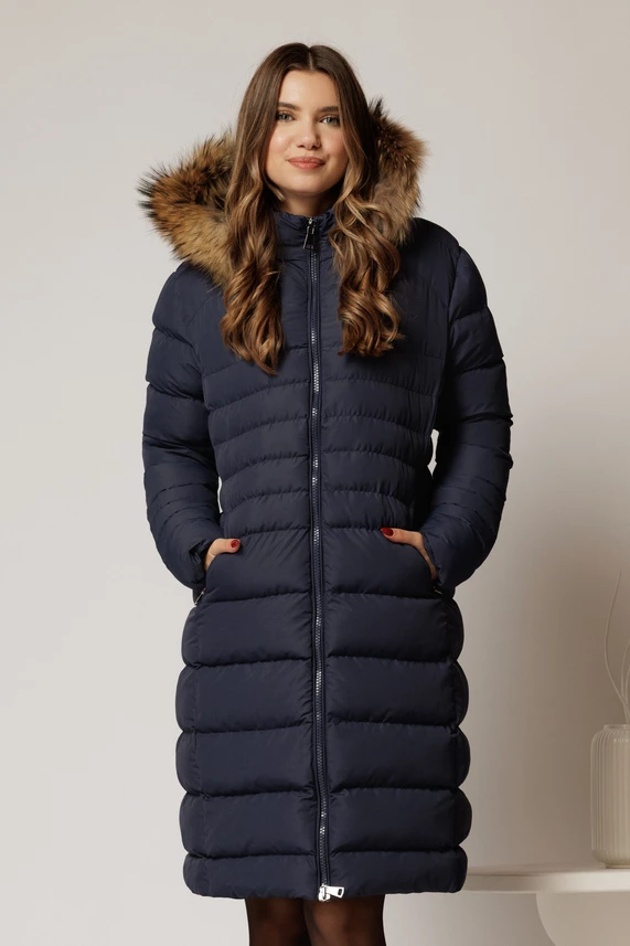 Este o geaca midi din fas bleumarin, potrivita pentru sezonul rece. Geaca are gluga detasabila, accesorizata cu blanita si buzunare.