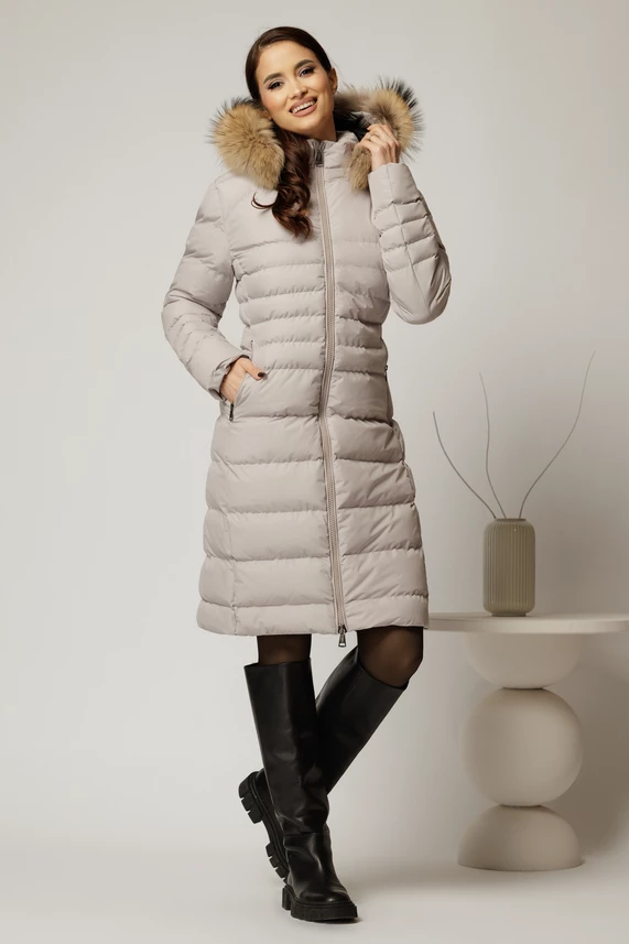 Este o geaca midi din fas gri deschis, potrivita pentru sezonul rece. Geaca are gluga detasabila, accesorizata cu blanita si buzunare.