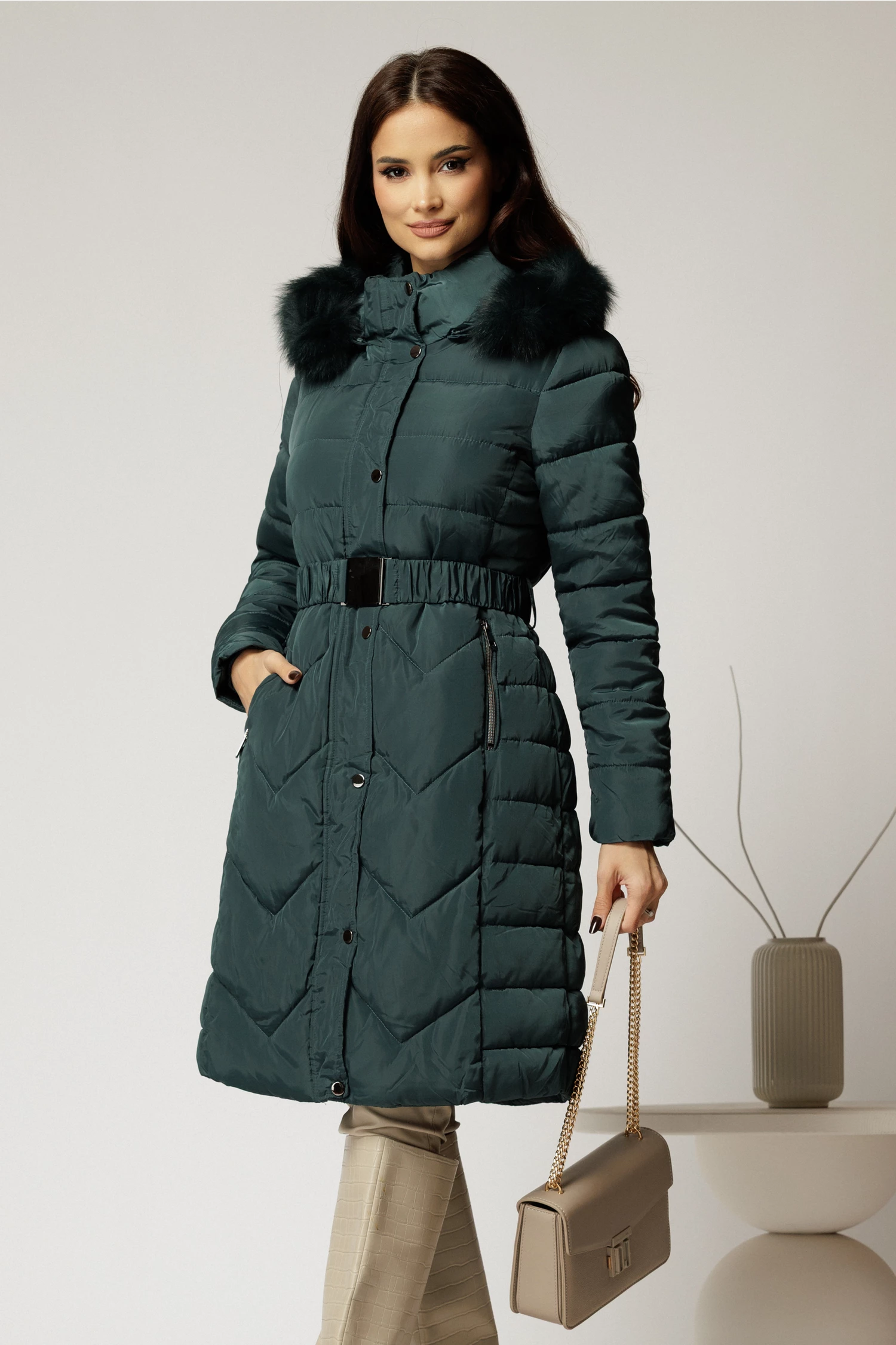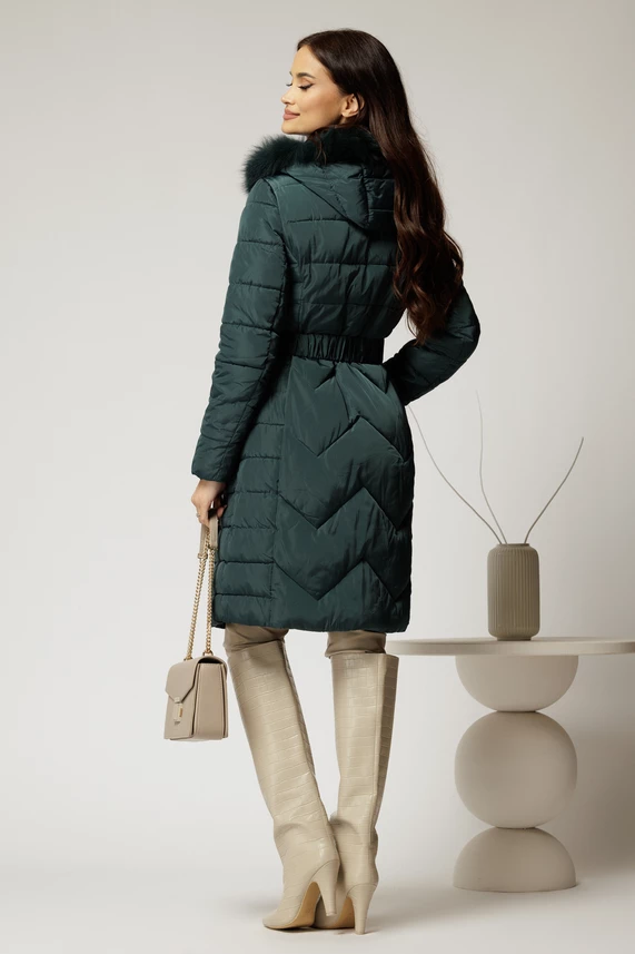 Este o geaca eleganta de dama in nuante de verde petrol, cu un croi cambrat care avantajeaza orice silueta, a carei talie este evidentiata de un cordon cu catarama.