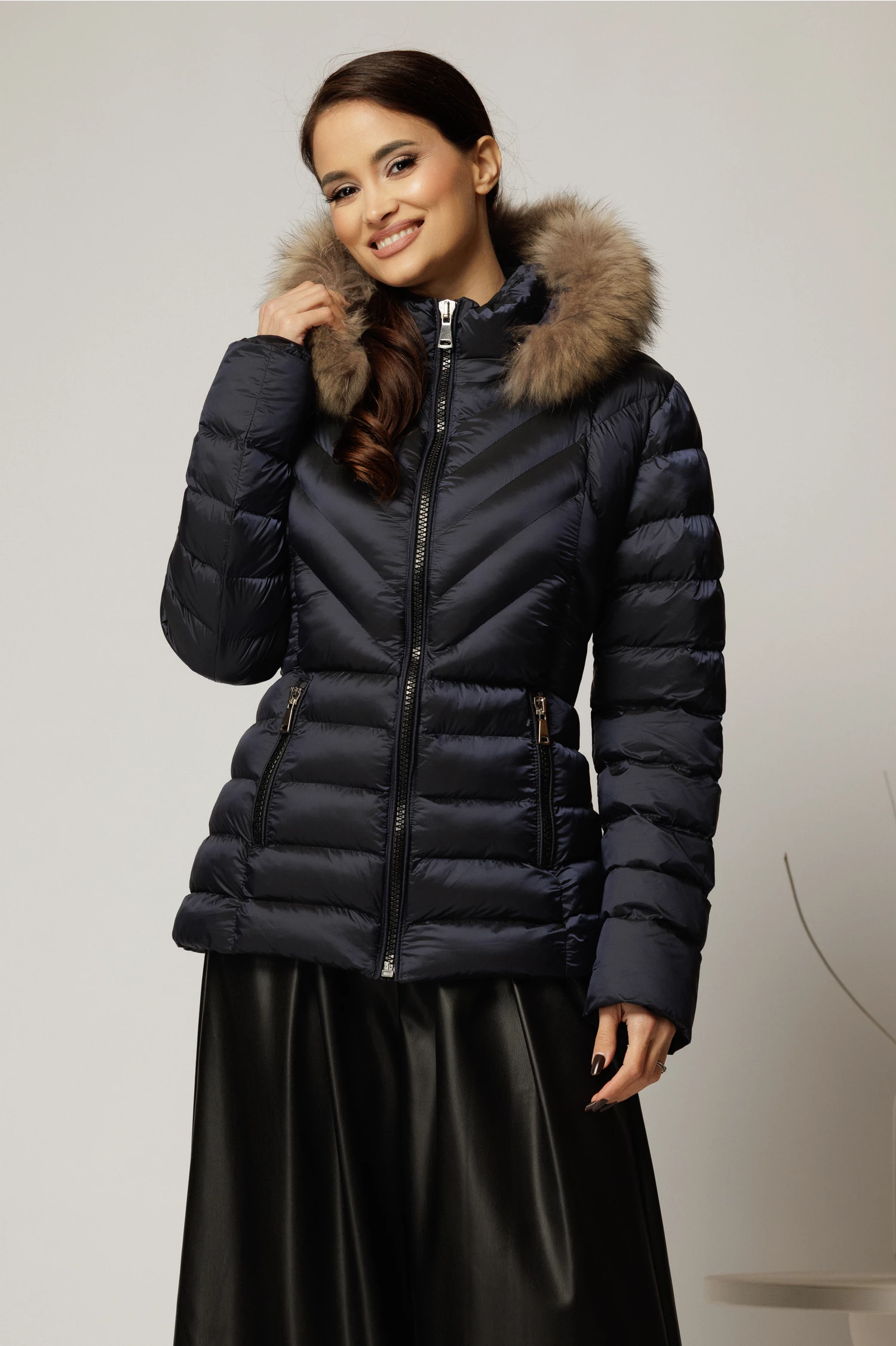 Geaca scurta bleumarin cu blanita naturala la gluga
