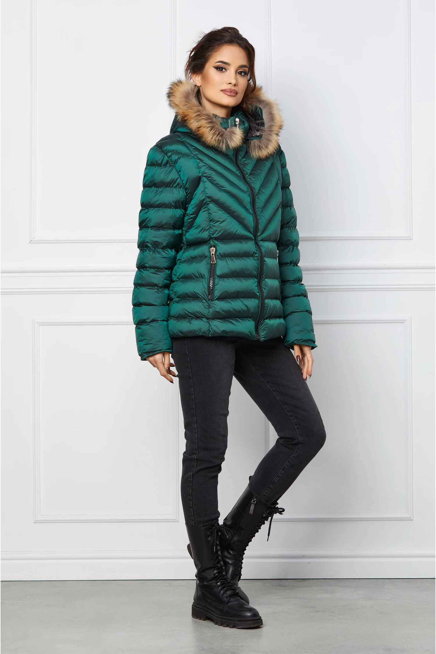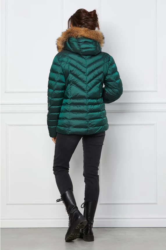 Geaca scurta verde cu blanita naturala la gluga