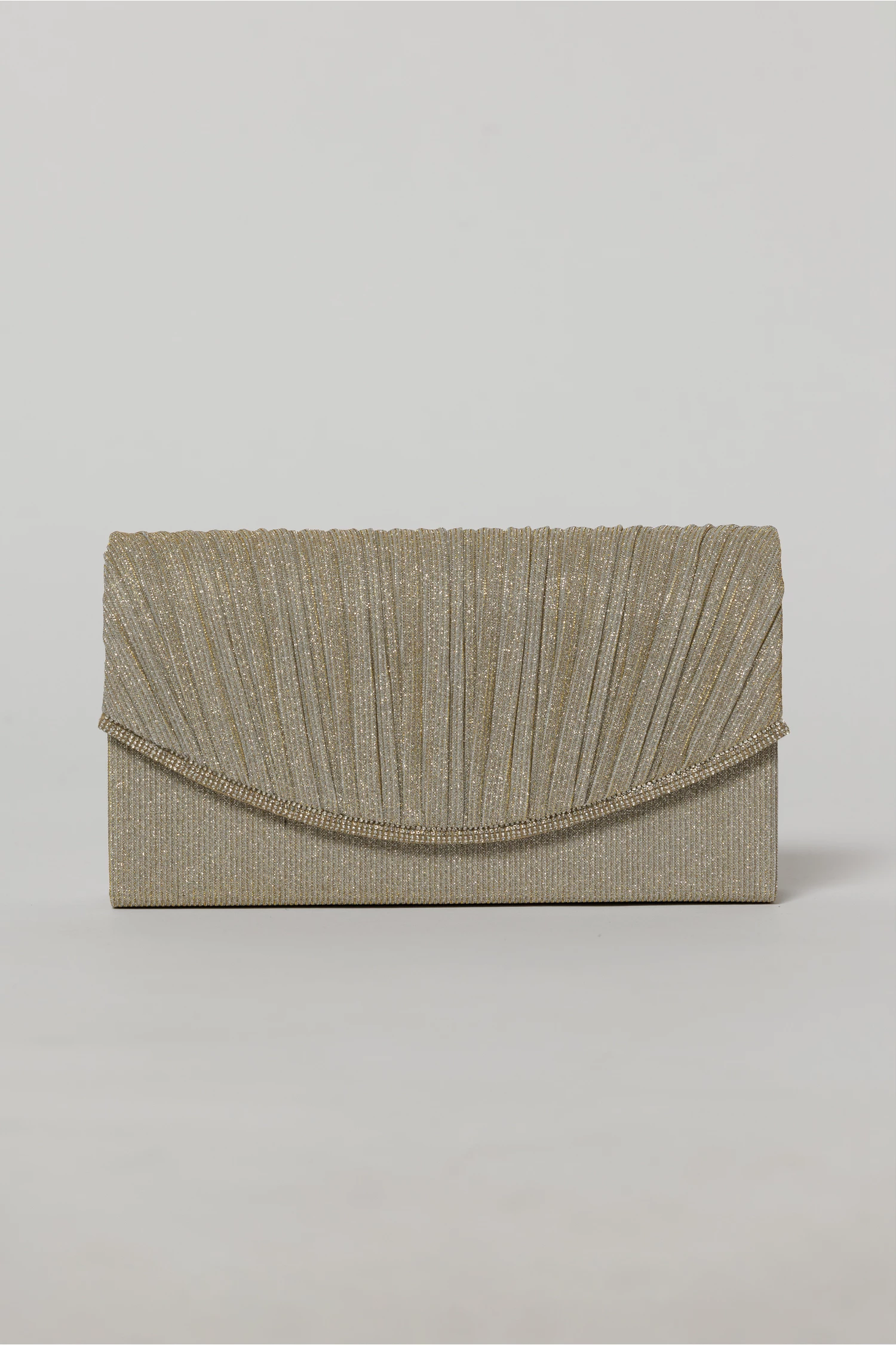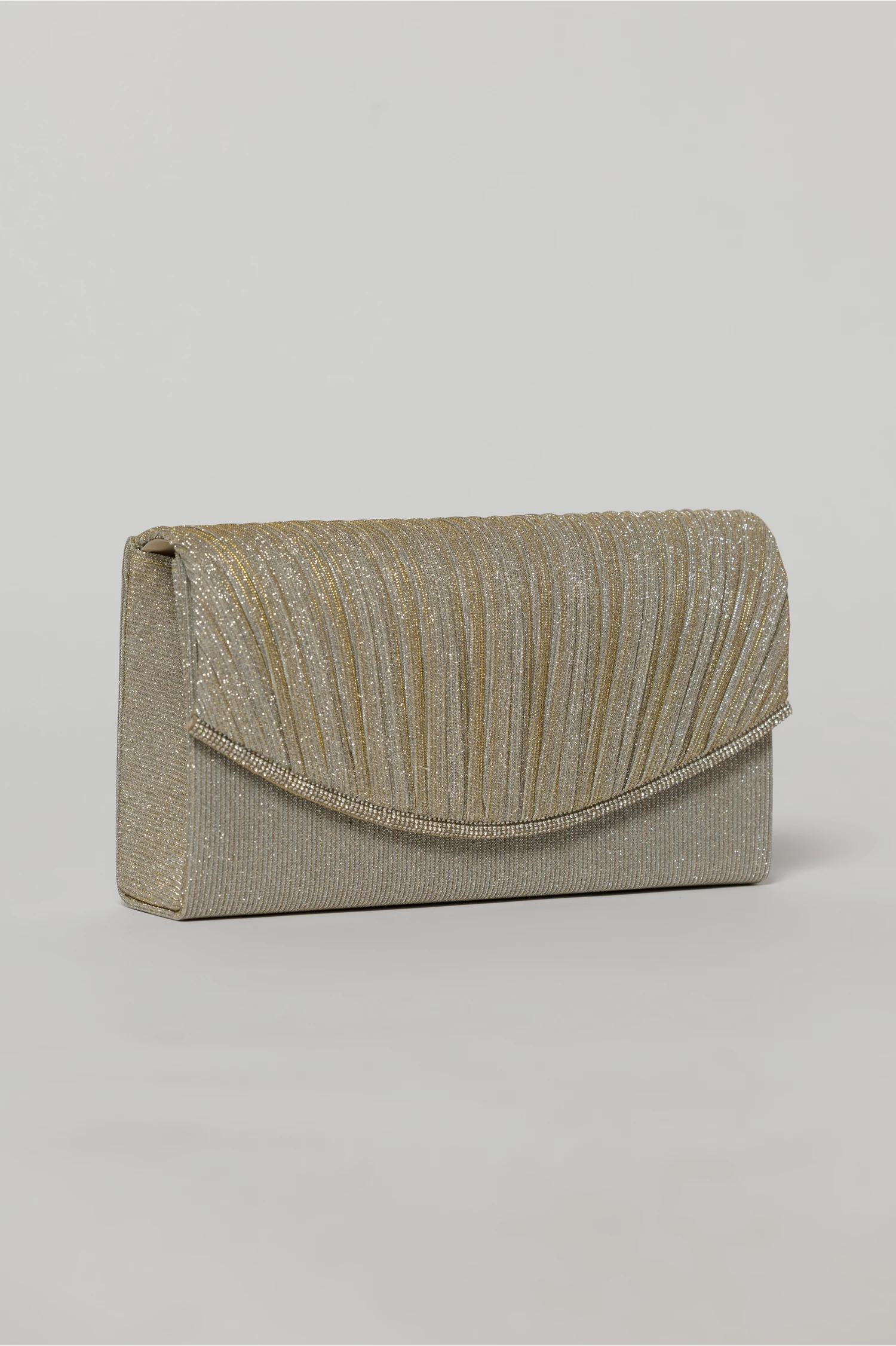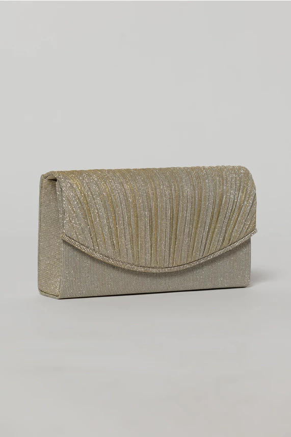 Clutch auriu elegant cu clapeta curbata si detalii plisate