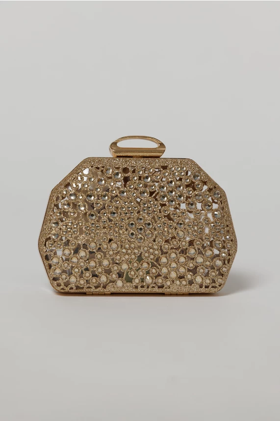 Clutch auriu elegant metalic cu strasuri si pietre decorative