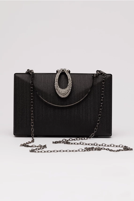 Clutch elegant din material cu textura fina si luciu subtil. Are un compatiment, maner rotund metalic, lant detasabil si inchidere metalica acoperita cu pietricele stralucitoare.