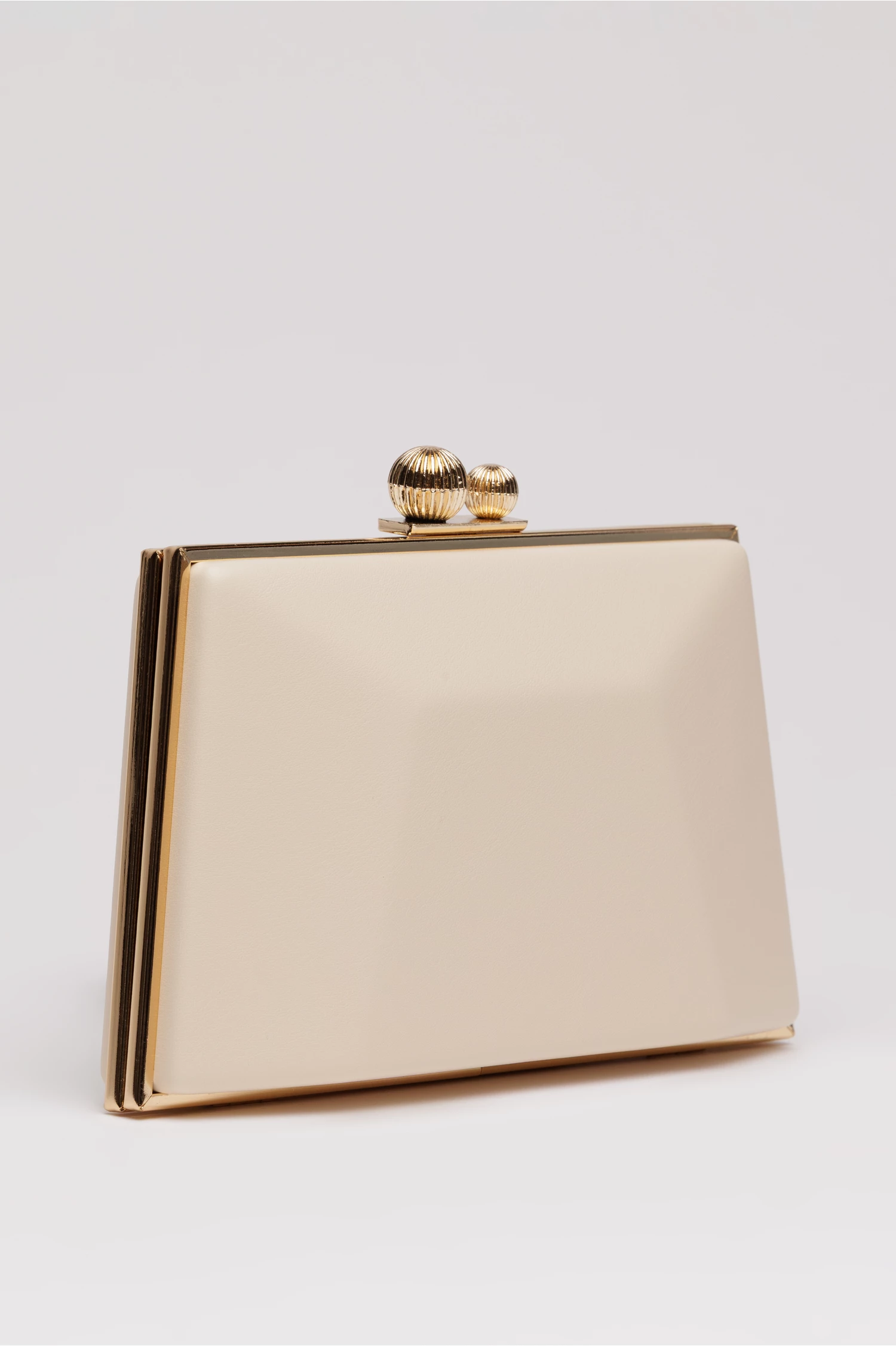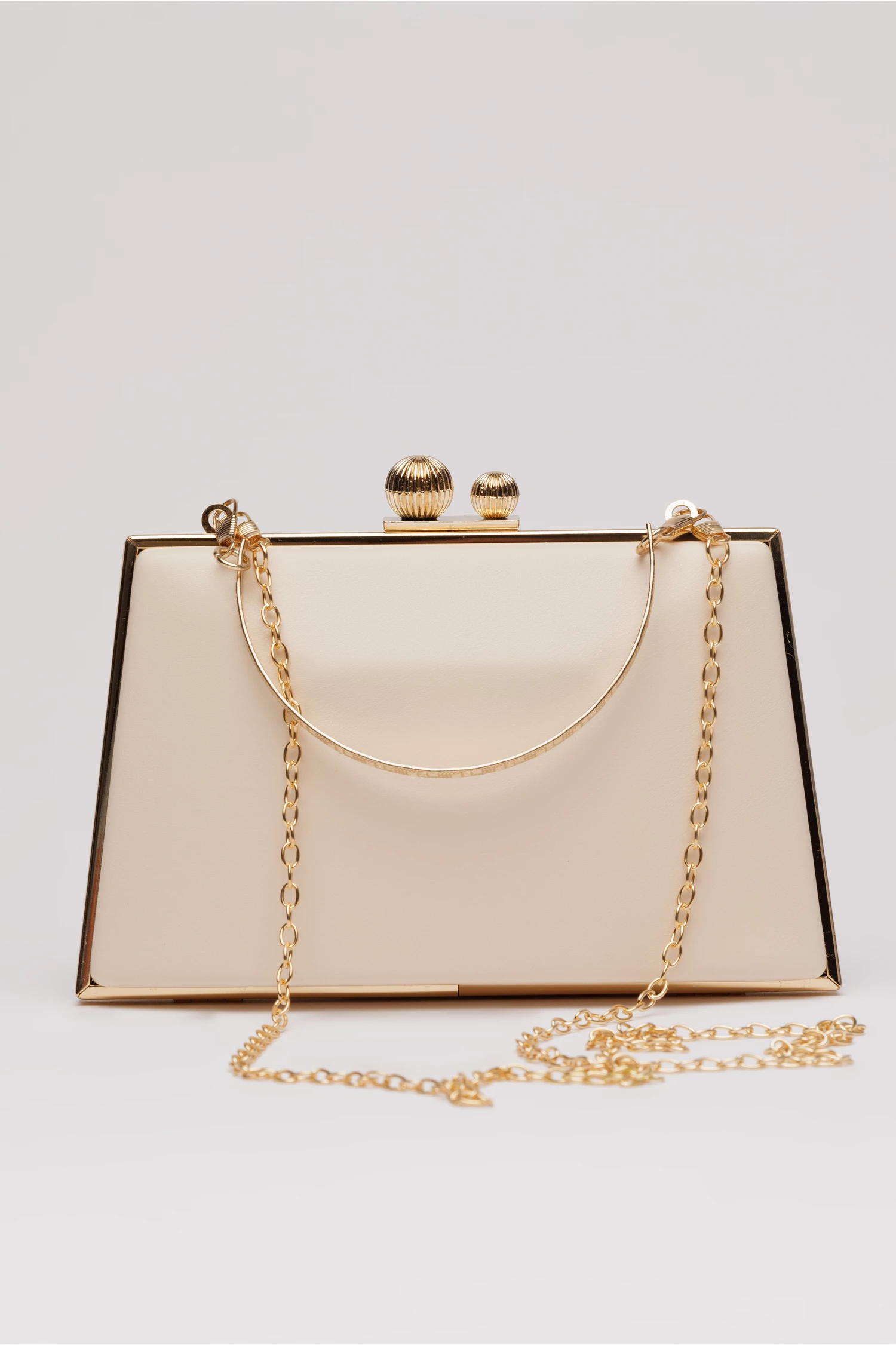Clutch elegant din material cu textura fina si rama metalica aurie. Are un compatiment, lant detasabil si inchidere metalica tip bila dubla.