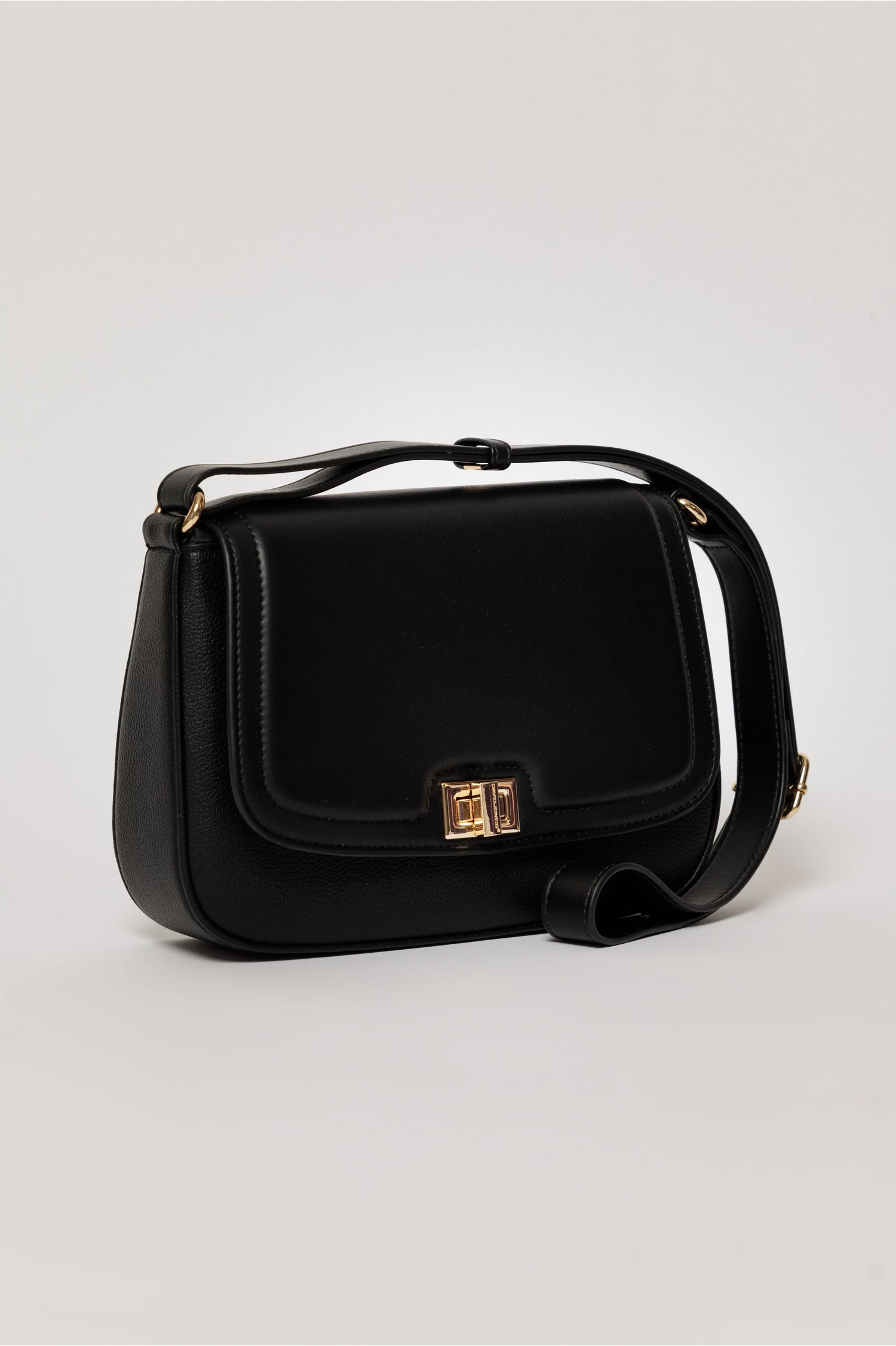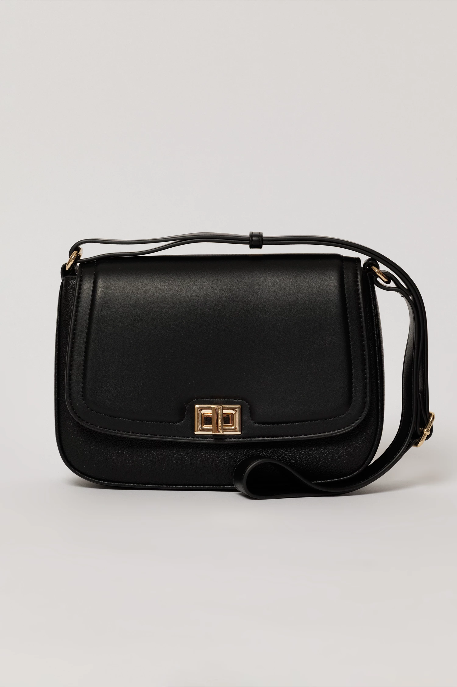 Geanta casual cu inchidere metalica aurie. Aceasta are doua buzunare laterale, curea detasabila si un compartiment care se inchide cu fermoar.