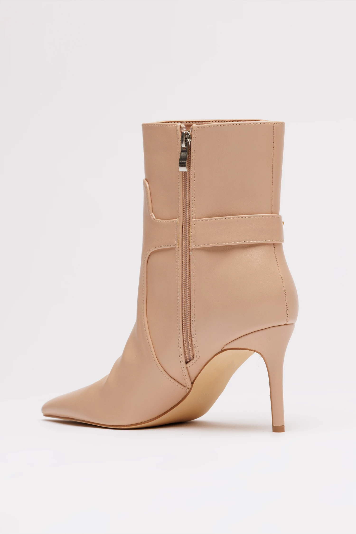 Botine beige elegante din piele ecologica. Au varf ascutit, toc subtire si se inchid cu fermoar.