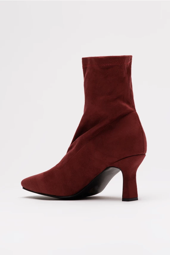 Botine bordo elegante din material textil catifelat. Au varf ascutit, toc subtire de tip conic si se inchid cu fermoar.