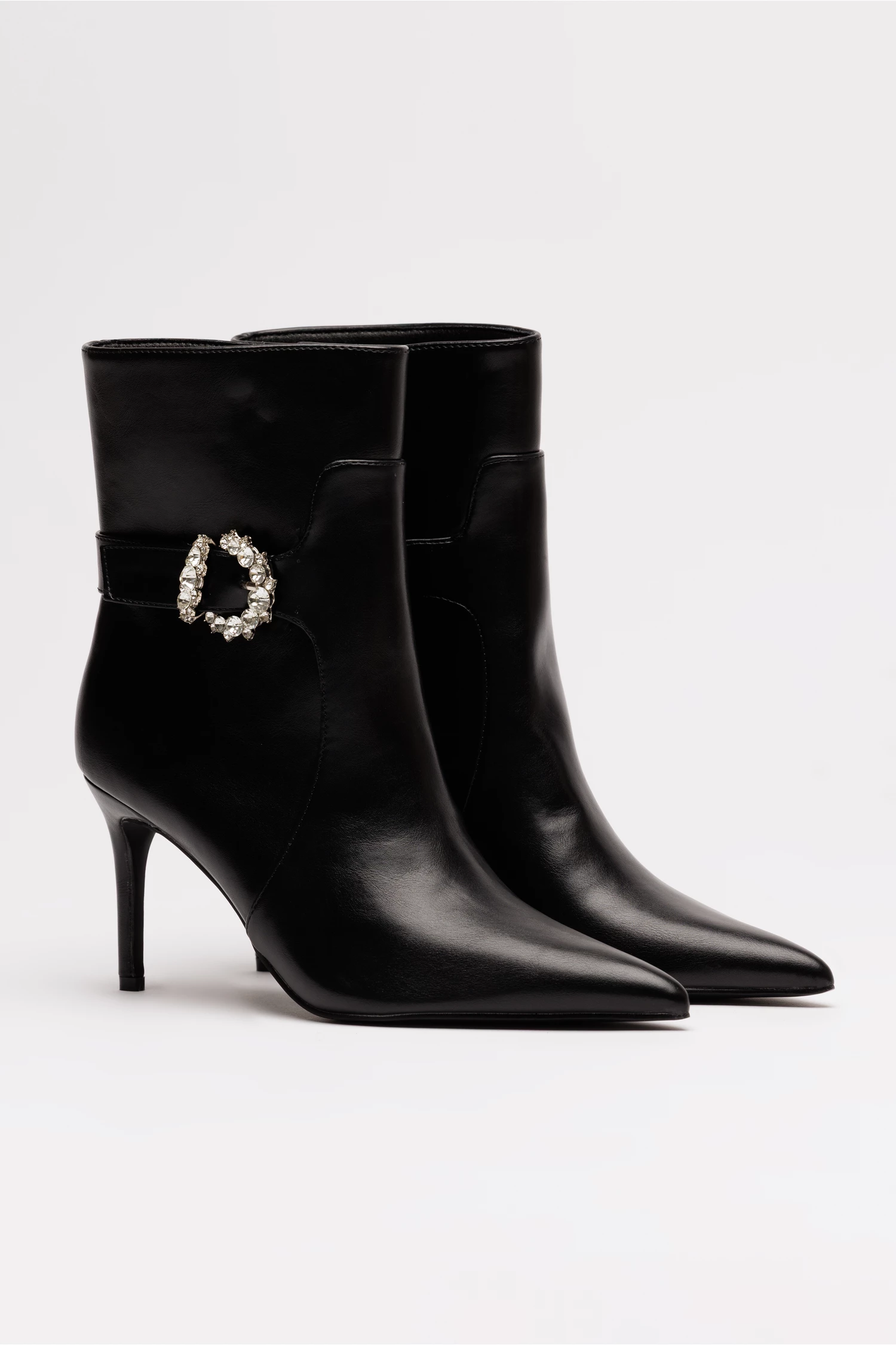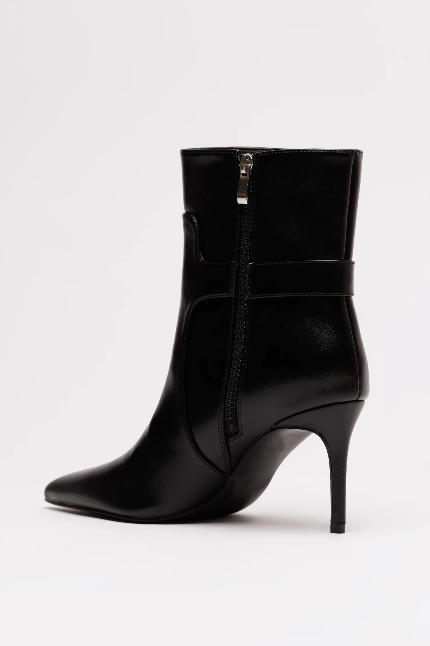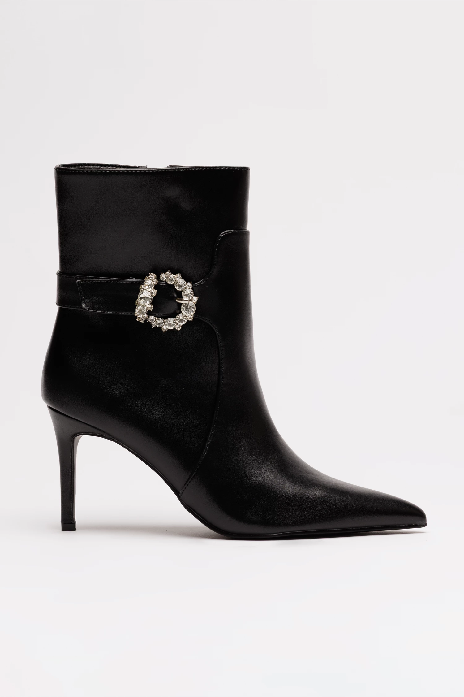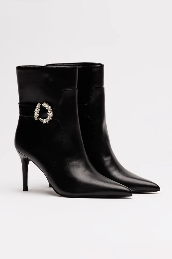 Botine negre din piele ecologica cu toc subtire si accesoriu