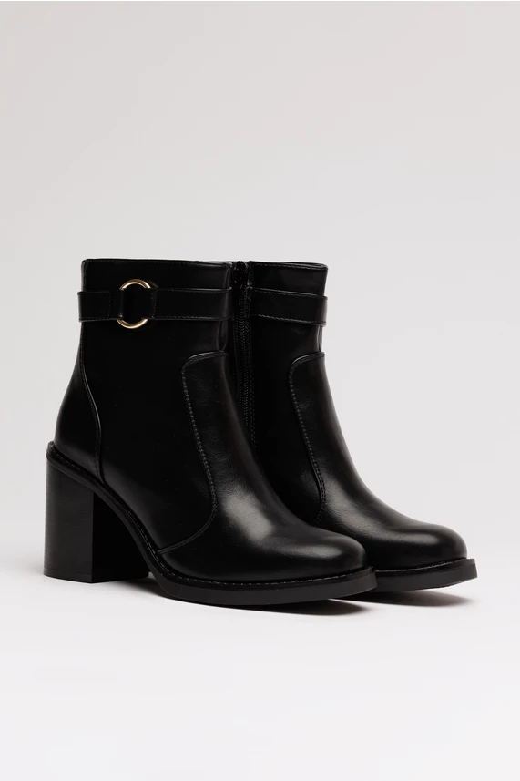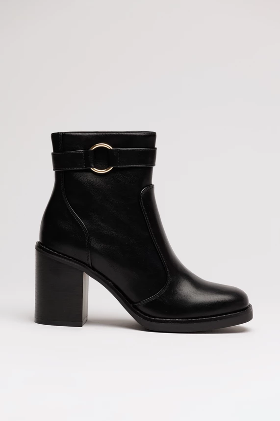 Botine elegante negre din piele ecologica. Au varf rotund, toc patrat, catarama aurie si se inchid cu fermoar.