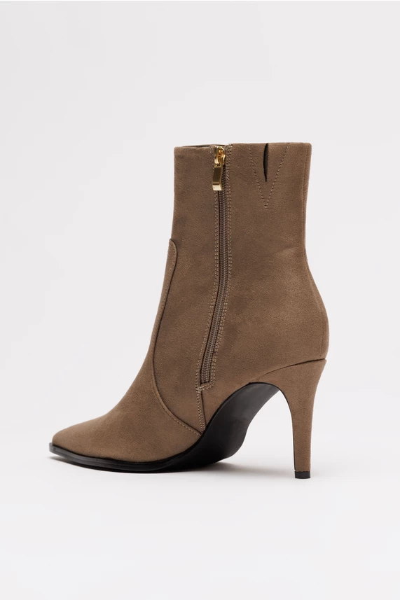 Botine taupe elegante din piele intoarsa ecologica. Au varf ascutit, toc subtire si se inchid cu fermoar.