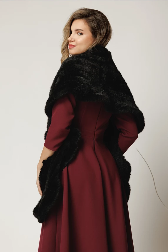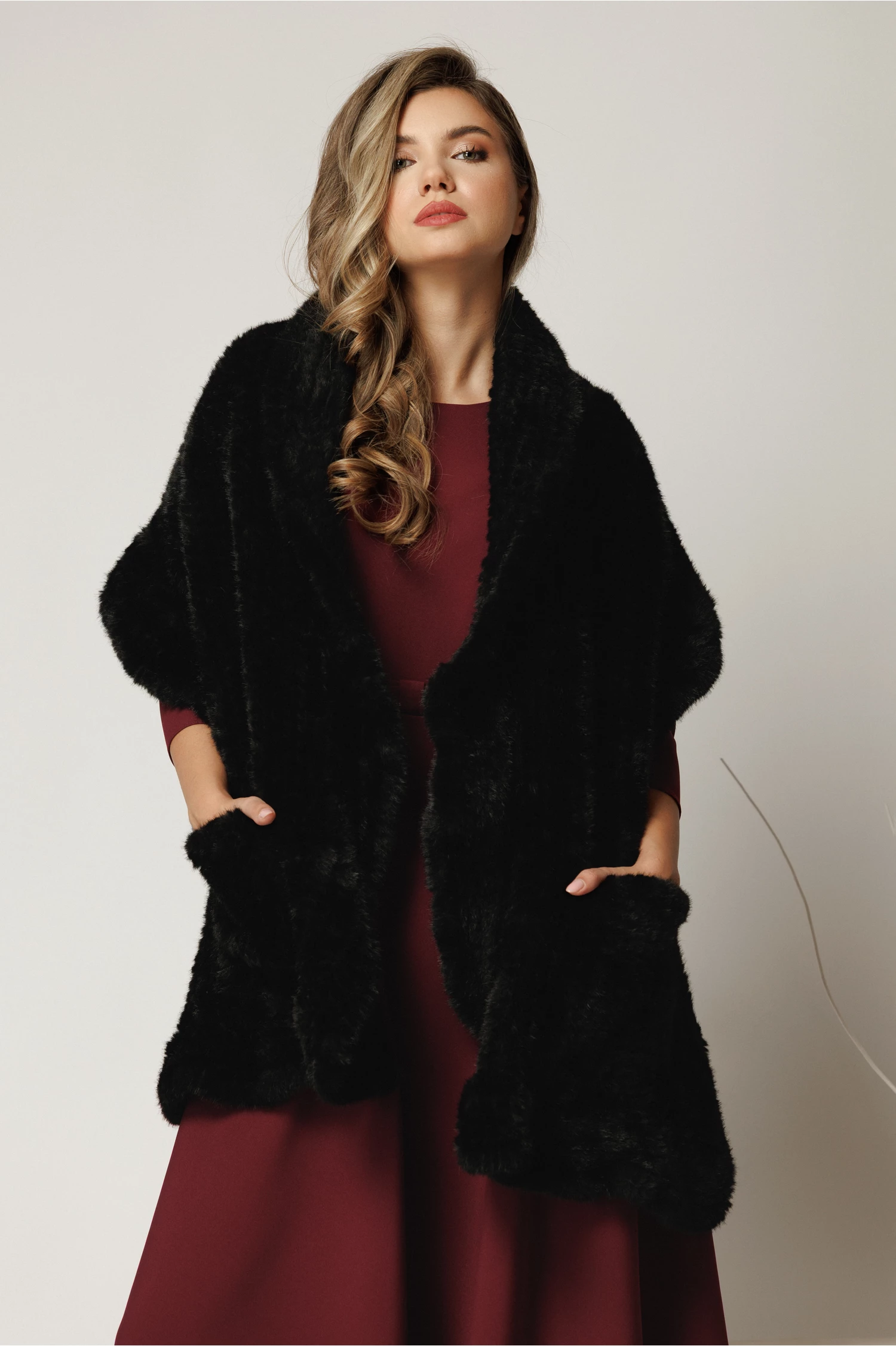 Capa eleganta din blana neagra cu decolteu in V, rever tip sal, buzunare functionale si inchidere cu sistem mos-baba.