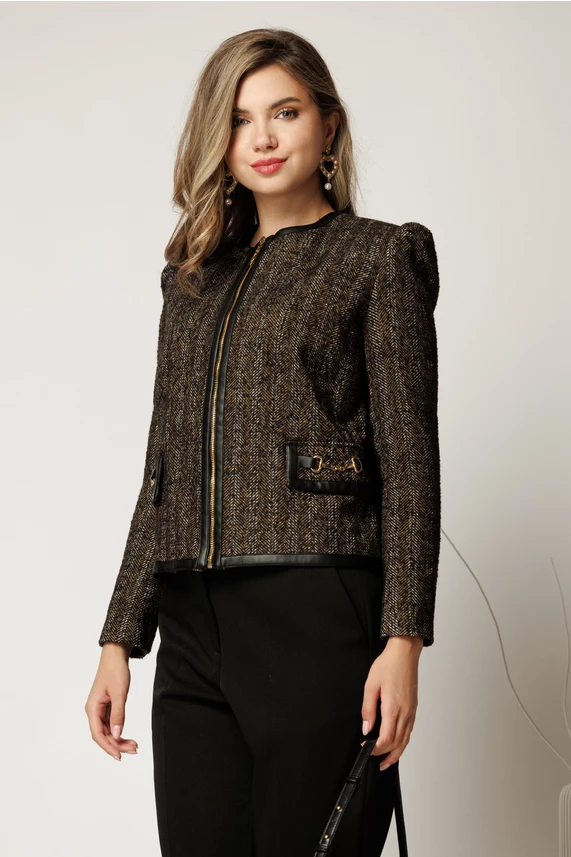 Jacheta DY Fashion eleganta din tweed negru cu maro